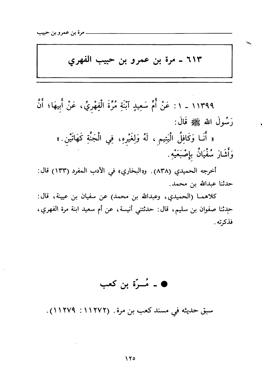سلف حديثه في مسند كَعْب بن مرَّة، رضي الله تعالى عنه (١١٢٧٢: ١١٢٧٩".