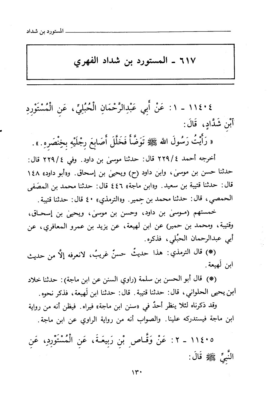 - وفي رواية: رَأَيْتُ النَّبِيَّ صلى الله عليه وسلم إِذَا تَوَضَّأَ دَلَكَ أَصَابِعَ رِجْلَيْهِ بِخِنْصَرِهِ.