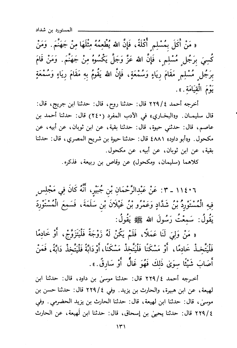 ١١٤٠٦ - عَنْ عَبْدِ الرَّحْمَانِ بْنِ جُبَيْرٍ، أَنَّهُ كَانَ فِي مَجْلِسٍ فِيهِ الْمُسْتَوْرِدُ بْنُ شَدَّادٍ، وَعَمْرُو بْنُ غَيْلَانَ بْنِ سَلَمَةَ، فَسَمِعَ الْمُسْتَوْرِدَ يَقُولُ: سَمِعْتُ رَسُولَ اللهِ صلى الله عليه وسلم يَقُولُ: