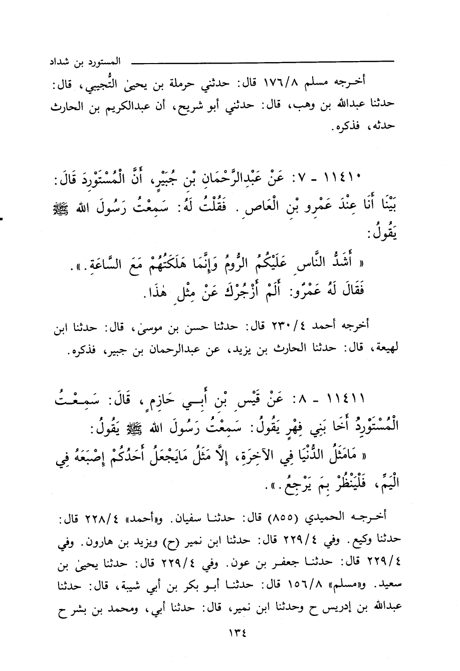 ١١٤١٠ - عَنْ عَبْدِ الرَّحْمَانِ بْنِ جُبَيْرٍ، أَنَّ الْمُسْتَوْرِدَ قَالَ: بَيْنَا أَنَا عِنْدَ عَمْرِو بْنِ الْعَاصِ، فَقُلْتُ لَهُ: سَمِعْتُ رَسُولَ اللهِ صلى الله عليه وسلم يَقُولُ:
