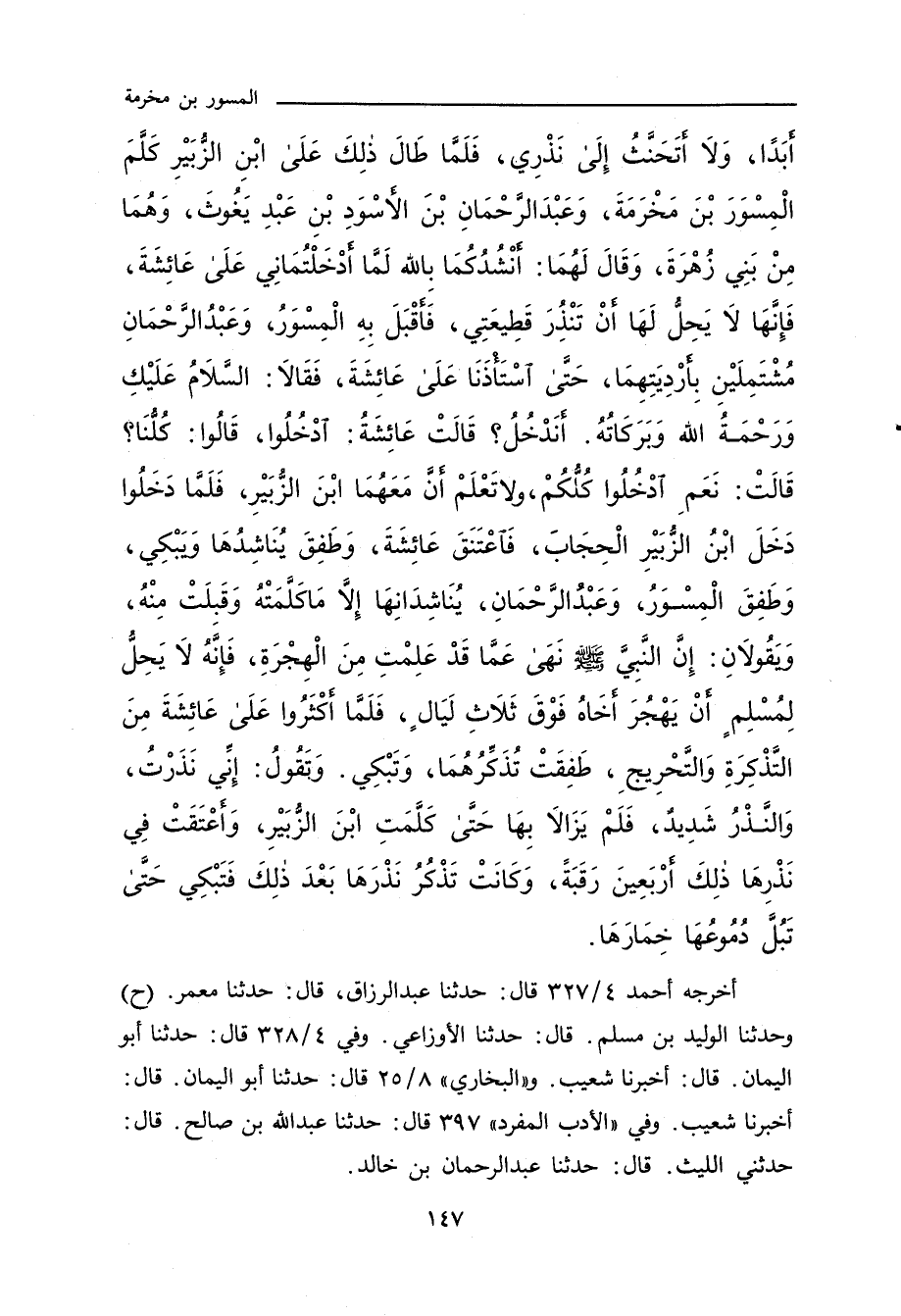 فَإِنَّهُ لَا يَحِلُّ لِمُسْلِمٍ أَنْ يَهْجُرَ أَخَاهُ فَوْقَ ثَلَاثِ لَيَالٍ، فَلَمَّا أَكْثَرُوا عَلَى عَائِشَةَ مِنَ التَّذْكِرَةِ وَالتَّحْرِيجِ، طَفِقَتْ تُذَكِّرُهُمَا نَذْرَهَا وَتَبْكِي، وَتَقُولُ: إِنِّي نَذَرْتُ، وَالنَّذْرُ شَدِيدٌ، فَلَمْ يَزَالَا بِهَا حَتَّى كَلَّمَتِ ابْنَ الزُّبَيْرِ، وَأَعْتَقَتْ فِي نَذْرِهَا ذَلِكَ أَرْبَعِينَ رَقَبَةً، وَكَانَتْ تَذْكُرُ نَذْرَهَا بَعْدَ ذَلِكَ فَتَبْكِي، حَتَّى تَبُلَّ دُمُوعُهَا خِمَارَهَا.