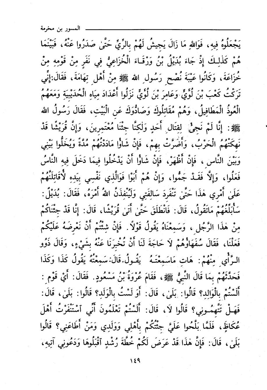 وَكَانُوا عَيْبَةَ نُصْحِ رَسُولِ اللهِ صلى الله عليه وسلم مِنْ أَهْلِ تِهَامَةَ، فَقَالَ: إِنِّي تَرَكْتُ كَعْبَ ابْنَ لُؤَيٍّ، وَعَامِرَ بْنَ لُؤَيٍّ، نَزَلُوا أَعْدَادَ مِيَاهِ الْحُدَيْبِيَةِ، وَمَعَهُمُ الْعُوذُ الْمَطَافِيلُ، وَهُمْ مُقَاتِلُوكَ، وَصَادُّوكَ عَنِ الْبَيْتِ، فَقَالَ رَسُولُ اللهِ صلى الله عليه وسلم: إِنَّا لَمْ نَجِئْ لِقِتَالِ أَحَدٍ، وَلَكِنَّا جِئْنَا مُعْتَمِرِينَ، وَإِنَّ قُرَيْشًا قَدْ نَهِكَتْهُمُ الْحَرْبُ، وَأَضَرَّتْ بِهِمْ، فَإِنْ شَاؤُوا مَادَدْتُهُمْ مُدَّةً، وَيُخَلُّوا بَيْنِي وَبَيْنَ النَّاسِ، فَإِنْ أَظْهَرْ، فَإِنْ شَاؤُوا أَنْ يَدْخُلُوا فِيمَا دَخَلَ فِيهِ النَّاسُ فَعَلُوا، وَإِلَاّ فَقَدْ جَمُّوا، وَإِنْ هُمْ أَبَوْا، فَوَالَّذِي نَفْسِي بِيَدِهِ، لأُقَاتِلَنَّهُمْ عَلَى أَمْرِي هَذَا، حَتَّى تَنْفَرِدَ سَالِفَتِي، وَلَيُنْفِذَنَّ اللهُ أًمْرَهُ، فَقَالَ بُدَيْلٌ: سَأُبَلِّغُهُمْ مَا تَقُولُ، قَالَ: فَانْطَلَقَ حَتَّى أَتَى قُرَيْشًا، قَالَ: إِنَّا قَدْ جِئْنَاكُمْ مِنْ هَذَا الرَّجُلِ، وَسَمِعْنَاهُ يَقُولُ قَوْلاً، فَإِنْ شِئْتُمْ أَنْ نَعْرِضَهُ عَلَيْكُمْ فَعَلْنَا، فَقَالَ سُفَهَاؤُهُمْ: لَا حَاجَةَ لَنَا أَنْ تُخْبِرَنَا عَنْهُ بِشَيْءٍ، وَقَالَ ذَوُو الرَّأْيِ مِنْهُمْ: هَاتِ مَا سَمِعْتَهُ يَقُولُ، قَالَ: سَمِعْتُهُ يَقُولُ كَذَا وَكَذَا، فَحَدَّثَهُمْ بِمَا قَالَ النَّبِيُّ صلى الله عليه وسلم، فَقَامَ عُرْوَةُ بْنُ مَسْعُودٍ، فَقَالَ: أَيْ قَوْمِ، أَلَسْتُمْ بِالْوَالِدِ؟ قَالُوا: بَلَى، قَالَ: أَوَلَسْتُ بِالْوَلَدِ؟ قَالُوا: بَلَى، قَالَ: فَهَلْ تَتَّهِمُونِي؟ قَالُوا: لَا، قَالَ: أَلَسْتُمْ تَعْلَمُونَ أَنِّي اسْتَنْفَرْتُ أَهْلَ عُكَاظَ، فَلَمَّا بَلَّحُوا عَلَيَّ
