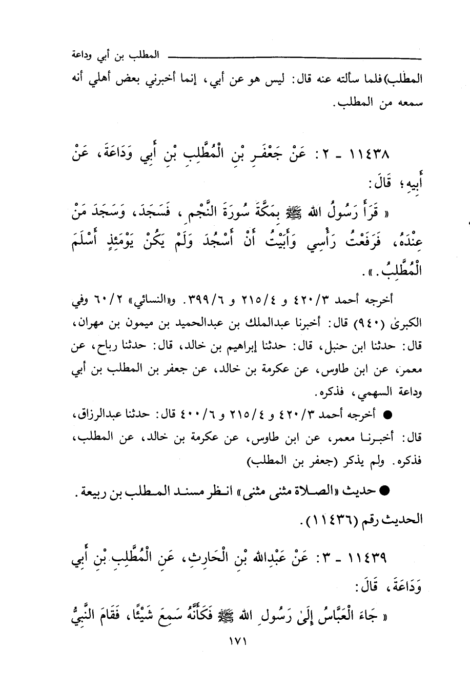 قَالَ الْمُطَّلِبُ: وَلَمْ أَسْجُدْ مَعَهُمْ، وَهُوَ يَوْمَئِذٍ مُشْرِكٌ، قَالَ الْمُطَّلِبُ: وَلَا أَدَعُ السُّجُودَ فِيهَا أَبَدًا. حم (٢٧٧٨٨) ليس فيه: جَعْفَر بن المُطَّلِب (.