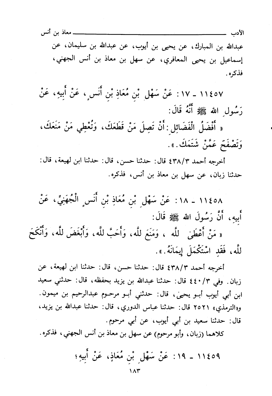 عَبْد الله بن المُبَارَك، عن يَحيى بن أَيُّوب، عن عَبْد الله بن سُلَيْمان، عن إِسْمَاعِيل بن يَحيى المَعَافِرِي، عن سَهْل بن مُعَاذ بن أَنَس الجُهَنِي، فذكره.
