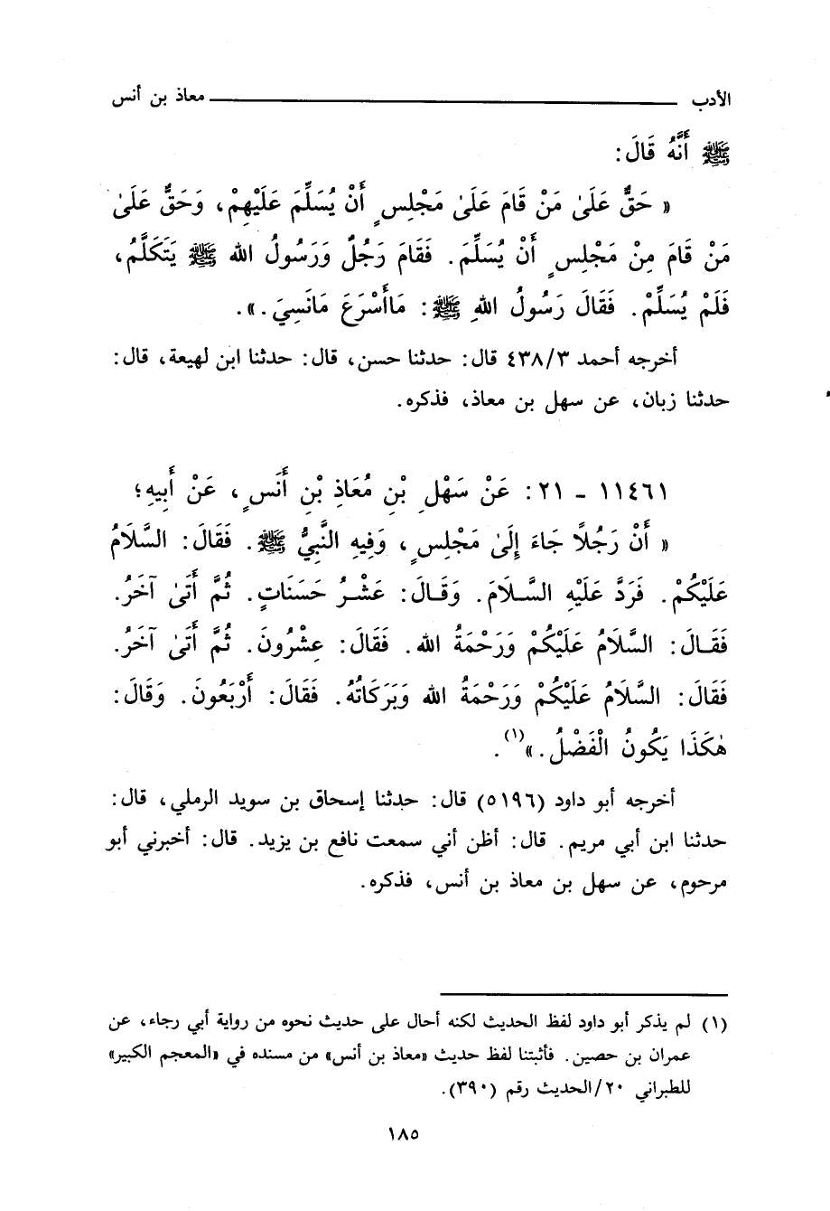 جَاءَ رَجُلٌ إِلَى النَّبِيِّ صلى الله عليه وسلم، فَقَالَ: السَّلَامُ. يْكُمْ، فَرَدَّ. يْهِ السَّلَامَ، ثُمَّ جَلَسَ، فَقَالَ النَّبِيُّ صلى الله عليه وسلم: عَشْرٌ، ثُمَّ جَاءَ آخَرُ، فَقَالَ: السَّلَامُ. يْكُمْ وَرَحْمَةُ اللهِ، فَرَدَّ. يْهِ، فَجَلَسَ، فَقَالَ: عِشْرُونَ، ثُمَّ جَاءَ آخَرُ، فَقَالَ: السَّلَامُ. يْكُمْ وَرَحْمَةُ اللهِ وَبَرَكَاتُهُ، فَرَدَّ. يْهِ، فَجَلَسَ، فَقَالَ: ثَلَاثُونَ.