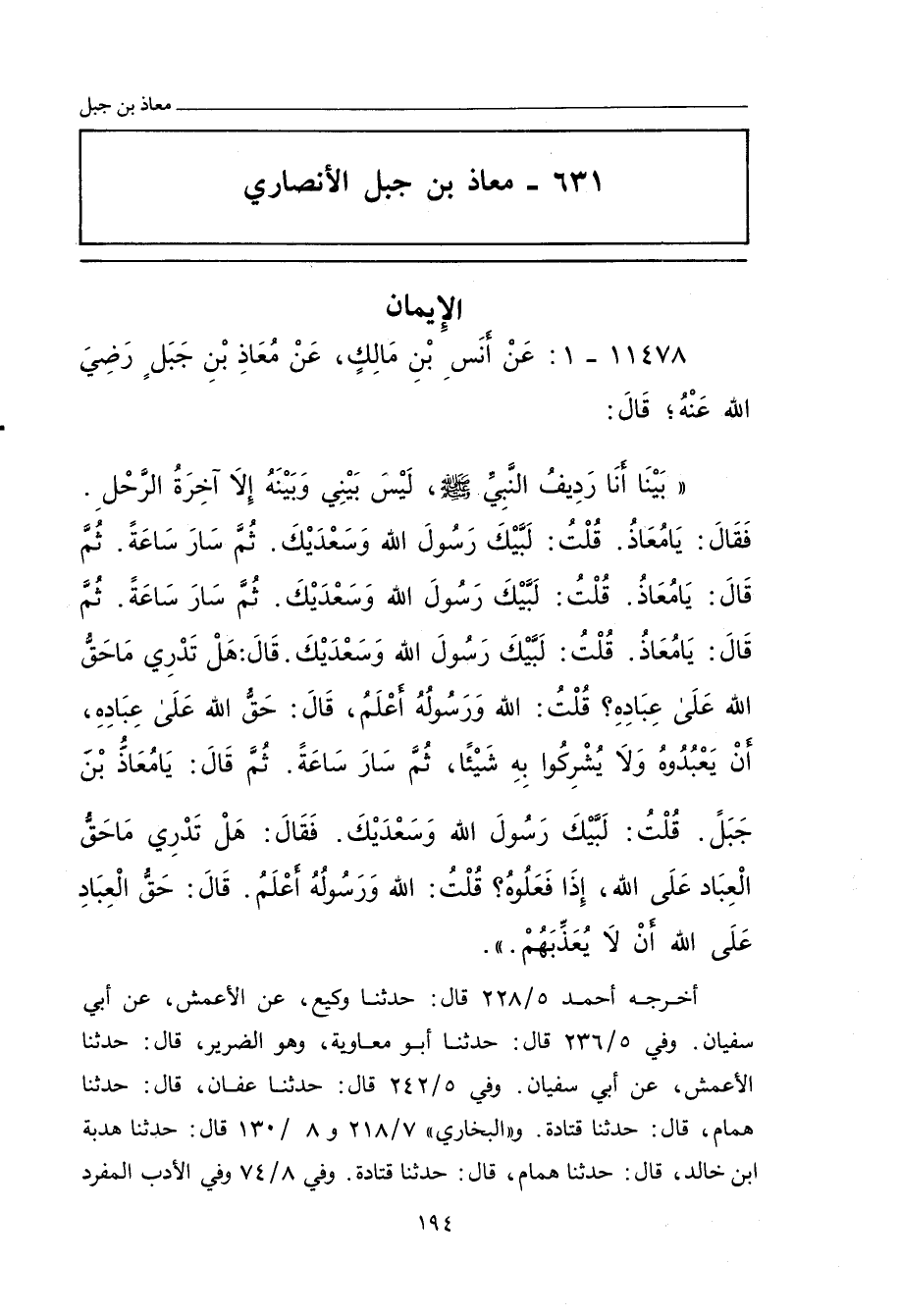 بَيْنَا أَنَا رَدِيفُ النَّبِيِّ صلى الله عليه وسلم، لَيْسَ بَيْنِي وَبَيْنَهُ إِلَاّ آخِرَةُ الرَّحْلِ، فَقَالَ: يَا مُعَاذُ، قُلْتُ: لَبَّيْكَ رَسُولَ اللهِ وَسَعْدَيْكَ، ثُمَّ سَارَ سَاعَةً، ثُمَّ قَالَ: يَا مُعَاذُ، قُلْتُ: لَبَّيْكَ رَسُولَ اللهِ وَسَعْدَيْكَ، ثُمَّ سَارَ سَاعَةً، ثُمَّ قَالَ: يَا مُعَاذُ، قُلْتُ: لَبَّيْكَ رَسُولَ اللهِ وَسَعْدَيْكَ، قَالَ: هَلْ تَدْرِي مَا حَقُّ اللهِ. ى عِبَادِهِ، قُلْتُ: اللهُ وَرَسُولُهُ أَعْلَمُ، قَالَ: حَقُّ اللهِ. ى عِبَادِهِ أَنْ يَعْبُدُوهُ وَلَا يُشْرِكُوا بِهِ شَيْئًا، ثُمَّ سَارَ سَاعَةً، ثُمَّ قَالَ: يَا مُعَاذُ بْنَ جَبَلٍ، قُلْتُ: لَبَّيْكَ رَسُولَ اللهِ وَسَعْدَيْكَ، فَقَالَ: هَلْ تَدْرِي مَا حَقُّ الْعِبَادِ. ى اللهِ إِذَا فَعَلُوهُ؟ قُلْتُ: اللهُ وَرَسُولُهُ أَعْلَمُ، قَالَ: حَقُّ الْعِبَادِ. ى اللهِ أَنْ لَا يُعَذِّبَهُمْ.