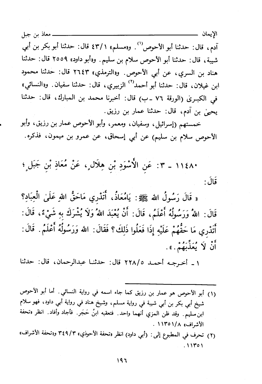 آدم، حدَّثنا أبو الأَحْوَص. و"مسلم"١/ ٤٣ (٥٣) قال: حدَّثنا أبو بَكْر بن أَبي شَيْبَة، حدَّثنا أبو الأَحْوَص، سَلَاّم بن سُلَيْم. و"أبو داود"٢٥٥٩ قال: حدَّثنا هَنَّاد بن السَّرِيّ، عن أَبي الأَحْوَص. و"التِّرمِذي"٢٦٤٣ قال: حدَّثنا محمود بن غَيْلَان، حدَّثنا أبو أحمد الزُّبَيْرِي، حدَّثنا سُفْيان. و"النَّسائي" في "الكبرى"٥٨٤٧ قال: أَخْبَرنا مُحَمد بن عَبْد الله بن المُبَارَك، قال: حدَّثنا يَحيى بن آدم، قال: حدَّثنا عَمَّار بن رُزَيْق.
