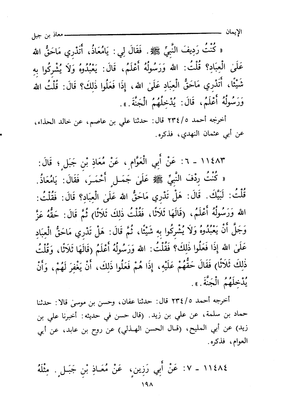 كُنْتُ رَدِيفَ النَّبِيِّ صلى الله عليه وسلم، فَقَالَ لِي: يَا مُعَاذُ، أَتَدْرِي مَا حَقُّ اللهِ. ى الْعِبَادِ؟ قُلْتُ: اللهُ وَرَسُولُهُ أَعْلَمُ، قَالَ: يَعْبُدُوهُ وَلَا يُشْرِكُوا بِهِ شَيْئًا، أَتَدْرِي مَا حَقُّ الْعِبَادِ. ى اللهِ إِذَا فَعَلُوا ذَلِكَ؟ قَالَ: قُلْتُ: اللهُ وَرَسُولُهُ أَعْلَمُ، قَالَ: يُدْخِلُهُمُ الْجَنَّةَ.
