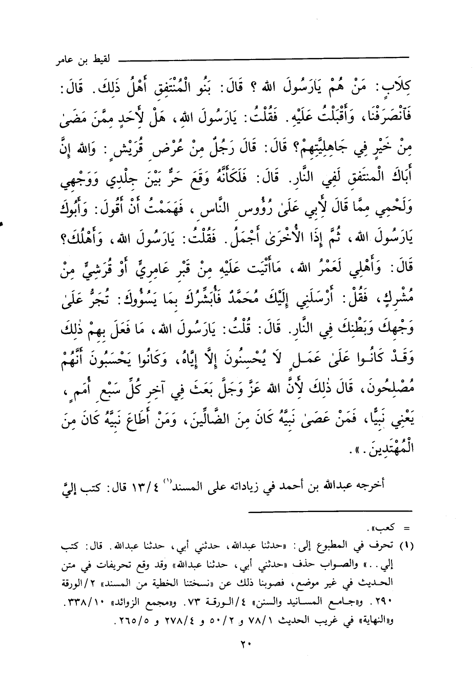 كِلَابٍ، مَنْ هُمْ يَا رَسُولَ اللهِ؟ قَالَ: بَنُو الْمُنْتَفِقِ أَهْلُ ذَلِكَ، قَالَ: فَانْصَرَفْنَا، وَأَقْبَلْتُ عَلَيْهِ، فَقُلْتُ: يَا رَسُولَ اللهِ، هَلْ لأَحَدٍ مِمَّنْ مَضَى مِنْ خَيْرٍ فِي جَاهِلِيَّتِهِمْ؟ قَالَ: قَالَ رَجُلٌ مِنْ عُرْضِ قُرَيْشٍ: وَاللهِ إِنَّ أَبَاكَ الْمُنْتَفِقَ لَفِي النَّارِ، قَالَ: فَلَكَأَنَّهُ وَقَعَ حَرٌّ بَيْنَ جِلْدِي وَوَجْهِي وَلَحْمِي، مِمَّا قَالَ لأَبِي عَلَى رُؤُوسِ النَّاسِ، فَهَمَمْتُ أَنْ أَقُولَ: وَأَبُوكَ يَا رَسُولَ اللهِ، ثُمَّ إِذَا الأُخْرَى أَجْمَلُ، فَقُلْتُ: يَا رَسُولَ اللهِ، وَأَهْلُكَ؟ قَالَ: وَأَهْلِي لَعَمْرُ