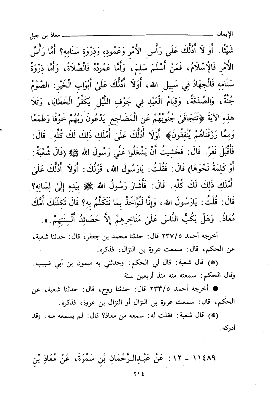 شَيْئًا، أَوَلَا أَدُلُّكَ. ى رَأْسِ الأَمْرِ، وَعَمُودِهِ، وَذُِرْوَةِ سَنَامِهِ؟ أَمَّا رَأْسُ الأَمْرِ فَالإِسْلَامُ، فَمَنْ أَسْلَمَ سَلِمَ، وَأَمَّا عَمُودُهُ فَالصَّلَاةُ، وَأَمَّا ذُِرْوَةُ سَنَامِهِ فَالْجِهَادُ فِي سَبِيلِ اللهِ، أَوَلَا أَدُلُّكَ. ى أَبْوَابِ الْخَيْرِ؟ الصَّوْمُ جُنَّةٌ، وَالصَّدَقَةُ، وَقِيَامُ الْعَبْدِ فِي جَوْفِ اللَّيْلِ يُكَفِّرُ الْخَطِيَئَةَ، وَتَلَا هَذِهِ الآيَةَ: "تَتَجَافَى جُنُوبُهُمْ عَنِ الْمَضَاجِعِ يَدْعُونَ رَبَّهُمْ خَوْفًا وَطَمَعًا وَمِمَّا رَزَقْنَاهُمْ يُنْفِقُونَ) أَوَلَا أَدُلُّكَ. ى أَمْلَكِ ذَلِكَ لَكَ كُلِّهِ؟ قَالَ: فَأَقْبَلَ نَفَرٌ، قَالَ: فَخَشِيتُ أَنْ يَشْغَلُوا عَنِّي رَسُولَ اللهِ صلى الله عليه وسلم - قَالَ شُعْبَةُ: أَوْ كَلِمَةً نَحْوَهَا - قَالَ: فَقُلْتُ: يَا رَسُولَ اللهِ، قَوْلُكَ: أَلَا أَدُلُّكَ. ى أَمْلَكِ ذَلِكَ لَكَ كُلِّهِ، قَالَ: فَأَشَارَ رَسُولُ اللهِ صلى الله عليه وسلم بِيَدِهِ إِلَى لِسَانِهِ، قَالَ: قُلْتُ: يَا رَسُولَ اللهِ، وَإِنَّا لَنُؤَاخَذُ بِمَا نَتَكَلَّمُ بِهِ؟ قَالَ: ثَكِلَتْكَ أُمُّكَ يَا مُعَاذُ، وَهَلْ يَكُبُّ النَّاسَ. ى مَنَاخِرِهِمْ إِلَاّ حَصَائِدُ أَلْسِنَتِهِمْ. حم