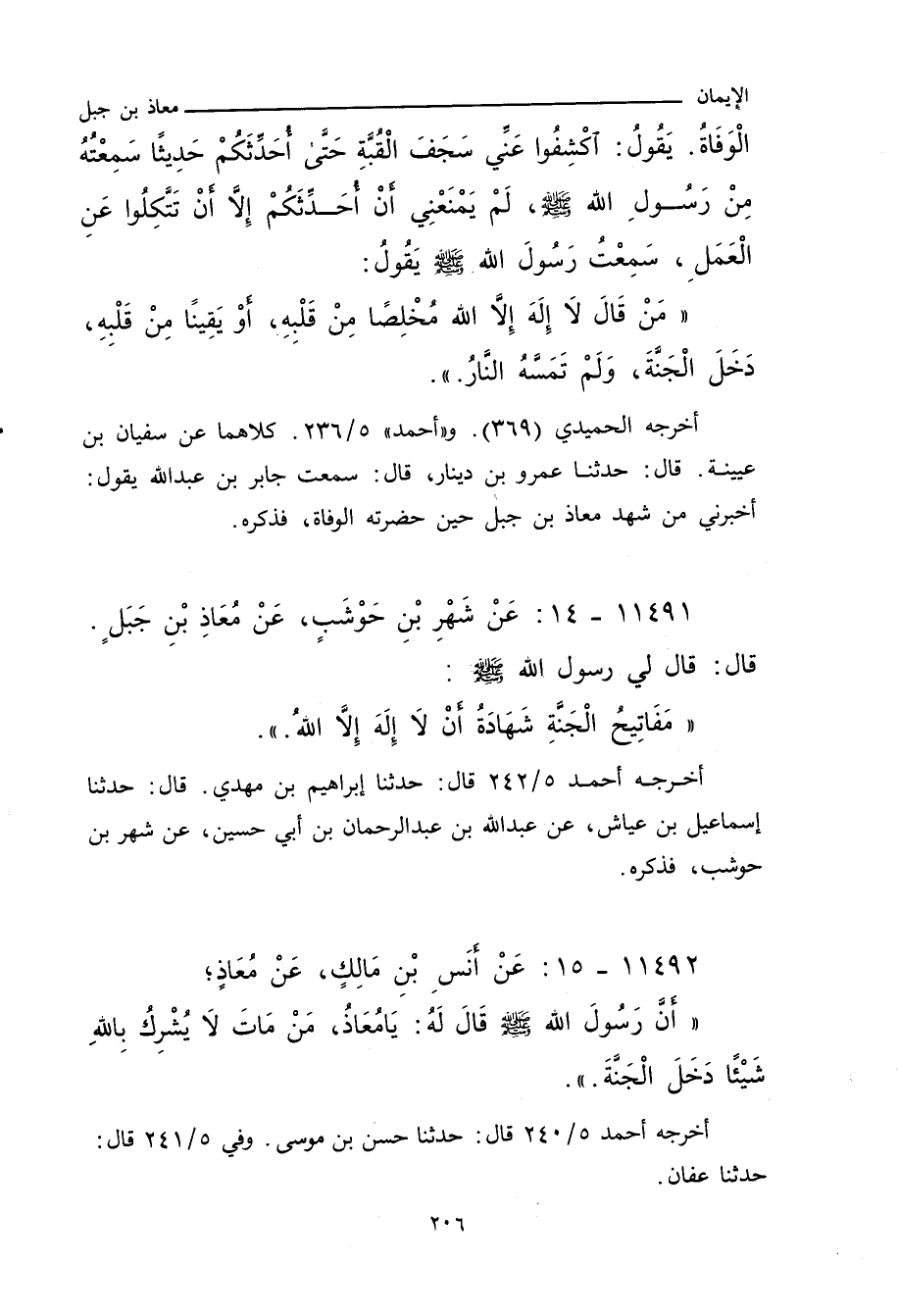 أخرجه الحُمَيْدِي (٣٦٩". وأحمد ٥/ ٢٣٦ (٢٢٤١٠) كلاهما عن سُفْيان بن عُيَيْنَة، قال: حدَّثنا عَمْرو بن دِينَار، قال: سَمِعْتُ جابر بن عَبْد الله يقول: أخبرني من شَهِدَ مُعَاذ بن جَبَل حين حضرته الوفاة، فذكره.