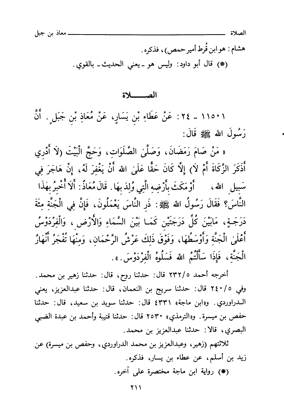 مَنْ صَامَ رَمَضَانَ، وَصَلَّى الصَّلَوَاتِ، وَحَجَّ الْبَيْتَ - لَا أَدْرِي أَذَكَرَ الزَّكَاةَ أَمْ لَا- إِلَاّ كَانَ حَقًّا. ى اللهِ أَنْ يَغْفِرَ لَهُ، إِنْ هَاجَرَ فِي سَبِيلِ اللهِ، أَوْ مَكَثَ بِأَرْضِهِ الَّتِى وُلِدَ بِهَا، قَالَ مُعَاذٌ: أَلَا أُخْبِرُ بِهَذَا النَّاسَ؟ فَقَالَ رَسُولُ اللهِ صلى الله عليه وسلم: ذَرِ النَّاسَ يَعْمَلُونَ، فَإِنَّ فِي الْجَنَّةِ مِئَةَ دَرَجَةٍ، مَا بَيْنَ كُلِّ دَرَجَتَيْنِ كَمَا بَيْنَ السَّمَاءِ وَالأَرْضِ، وَالْفِرْدَوْسُ أَعْلَى الْجَنَّةِ وَأَوْسَطُهَا، وَفَوْقَ ذَلِكَ عَرْشُ الرَّحْمَانِ، وَمِنْهَا تُفَجَّرُ أَنْهَارُ الْجَنَّةِ، فَإِذَا سَأَلْتُمُ اللهَ فَسَلُوهُ الْفِرْدَوْسَ.