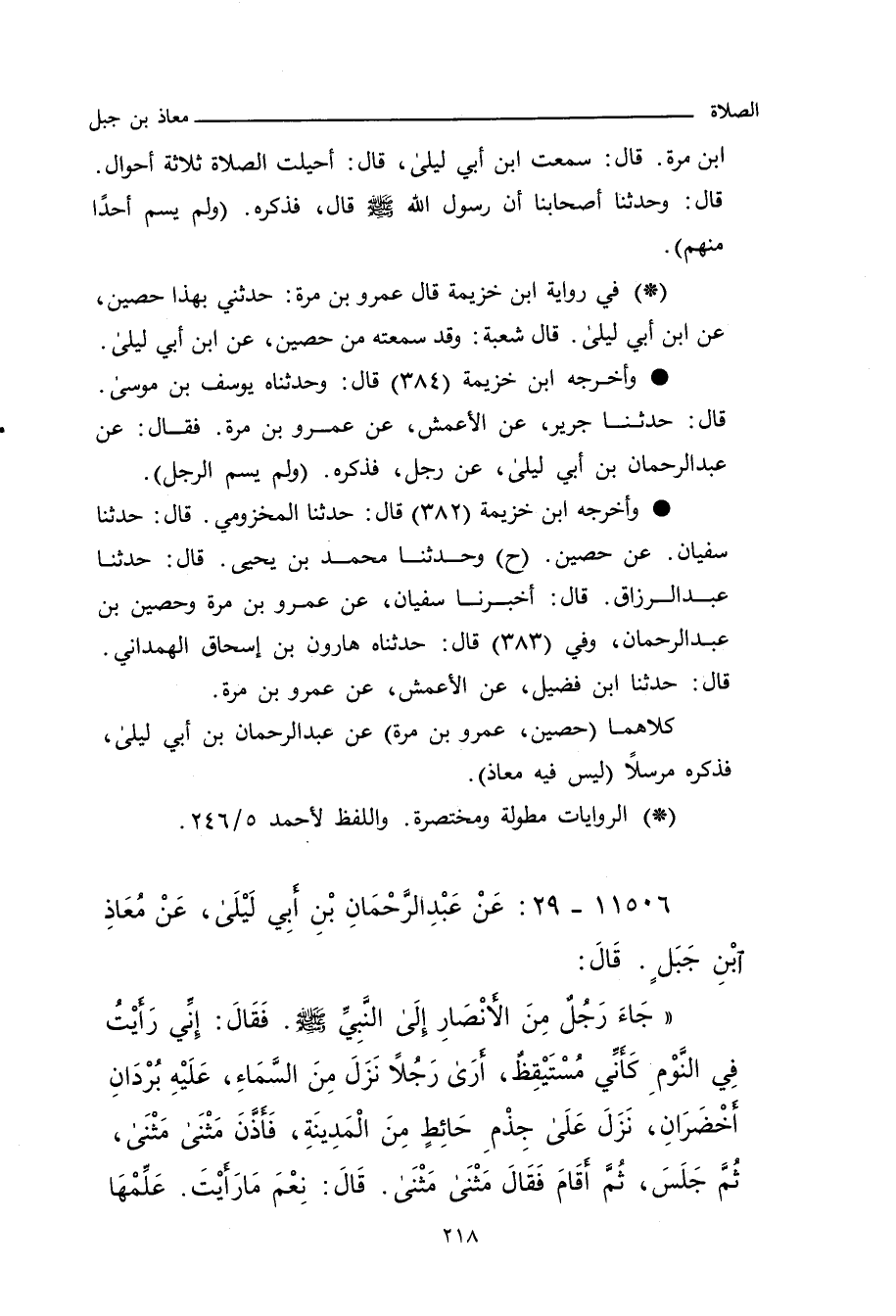 - وأخرجه ابن خُزَيْمَة (٣٨٤) قال: حدَّثناه يُوسُف بن مُوسَى، حدَّثنا جَرِير، عن الأَعْمَش، عن عَمْرو بن مُرَّة، فقال: عن عَبْد الرَّحْمان بن أَبي لَيْلَى، عن رجلٍ، بعض هذا الخبر، أعني قوله: أحيلت الصلاة ثلاثة أحوال، ولم يذكر عَبْد الله بن زَيْد، ولا معاذًا.