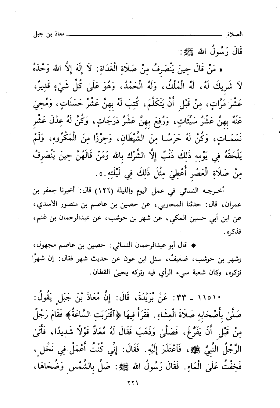 مَنْ قَالَ حِينَ يَنْصَرِفُ مِنْ صَلَاةِ الْغَدَاةِ: لَا إِلَهَ إِلَاّ اللهُ، وَحْدَهُ لَا شَرِيكَ لَهُ، لَهُ الْمُلْكُ وَلَهُ الْحَمْدُ، وَهُوَعَلَى كُلِّ شَيْءٍ قَدِيرٌ، عَشْرَ مَرَّاتٍ، مِنْ قَبْلِ أَنْ يَتَكَلَّمَ، كُتِبَ لَهُ بِهِنَّ عَشْرُ حَسَنَاتٍ، وَمُحِيَ عَنْهُ بِهِنَّ عَشْرُ سَيِّئَاتٍ، وَرُفِعَ بِهِنَّ عَشْرُ دَرَجَاتٍ، وَكُنَّ لَهُ عِدْلَ عَشْرِ نَسَمَاتٍ، وَكُنَّ لَهُ حَرَسًا مِنَ الشَّيْطَانِ، وَحِرْزًا مِنَ الْمَكْرُوهِ، وَلَمْ يَلْحَقْهُ فِي يَوْمِهِ ذَلِكَ ذَنْبٌ، إِلَاّ الشِّرْكَ بِاللهِ، وَمَنْ قَالَهُنَّ حِينَ يَنْصَرِفُ مِنْ صَلَاةِ الْعَصْرِ، أُعْطِيَ مِثْلَ ذَلِكَ فِي لَيْلَتِهِ.