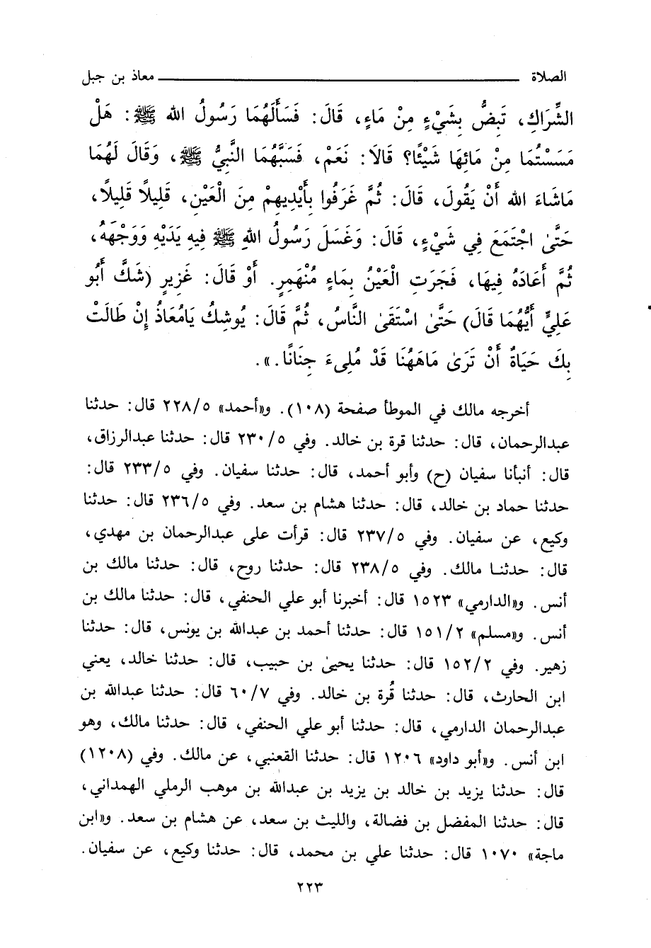 الشِّرَاكِ، تَبِضُّ بِشَيْءٍ مِنْ مَاءٍ، قَالَ: فَسَأَلَهُمَا رَسُولُ اللهِ صلى الله عليه وسلم: هَلْ مَسَسْتُمَا مِنْ مَائِهَا شَيْئًا؟ قَالَا: نَعَمْ، فَسَبَّهُمَا النَّبِيُّ صلى الله عليه وسلم، وَقَالَ لَهُمَا مَا شَاءَ اللهُ أَنْ يَقُولَ، قَالَ: ثُمَّ غَرَفُوا بِأَيْدِيهِمْ مِنَ الْعَيْنِ قَلِيلاً قَلِيلاً، حَتَّى اجْتَمَعَ فِي شَيْءٍ، قَالَ: وَغَسَلَ رَسُولُ اللهِ صلى الله عليه وسلم فِيهِ يَدَيْهِ وَوَجْهَهُ، ثُمَّ أَعَادَهُ فِيهَا، فَجَرَتِ الْعَيْنُ بِمَاءٍ مُنْهَمِرٍ، أَوْ قَالَ: غَزِيرٍ - شَكَّ أَبُو. يٍّ أَيُّهُمَا قَالَ - حَتَّى اسْتَقَى النَّاسُ، ثُمَّ قَالَ: يُوشِكُ يَا مُعَاذُ، إِنْ طَالَتْ بِكَ حَيَاةٌ، أَنْ تَرَى مَا هَا هُنَا قَدْ مُلِئَ جِنَانًا. م (٦٠١١)