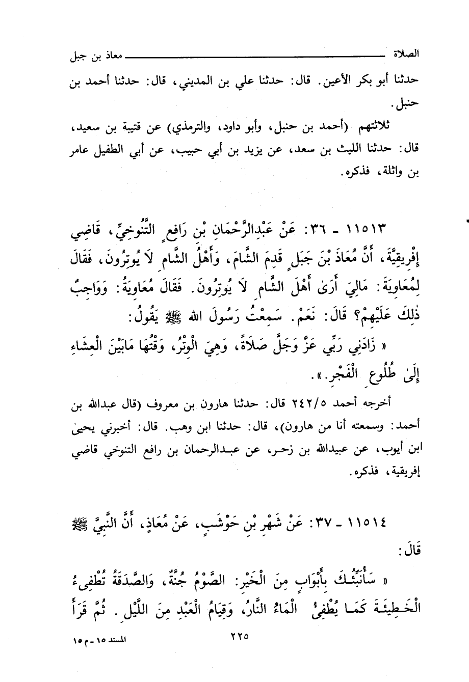 ١١٥١٣ - عَنْ عَبْدِ الرَّحْمَانِ بْنِ رَافِعٍ التَّنُوخِيِّ، قَاضِي إِفْرِيقِيَّةَ، أَنَّ مُعَاذَ ابْنَ جَبَلٍ قَدِمَ الشَّامَ، وَأَهْلُ الشَّامِ لَا يُوتِرُونَ، فَقَالَ لِمُعَاوِيَةَ: مَا لِي أَرَى أَهْلَ الشَّامِ لَا يُوتِرُونَ؟ فَقَالَ مُعَاوِيَةُ: وَوَاجِبٌ ذَلِكَ. يْهِمْ؟ قَالَ: نَعَمْ، سَمِعْتُ رَسُولَ اللهِ صلى الله عليه وسلم يَقُولُ: