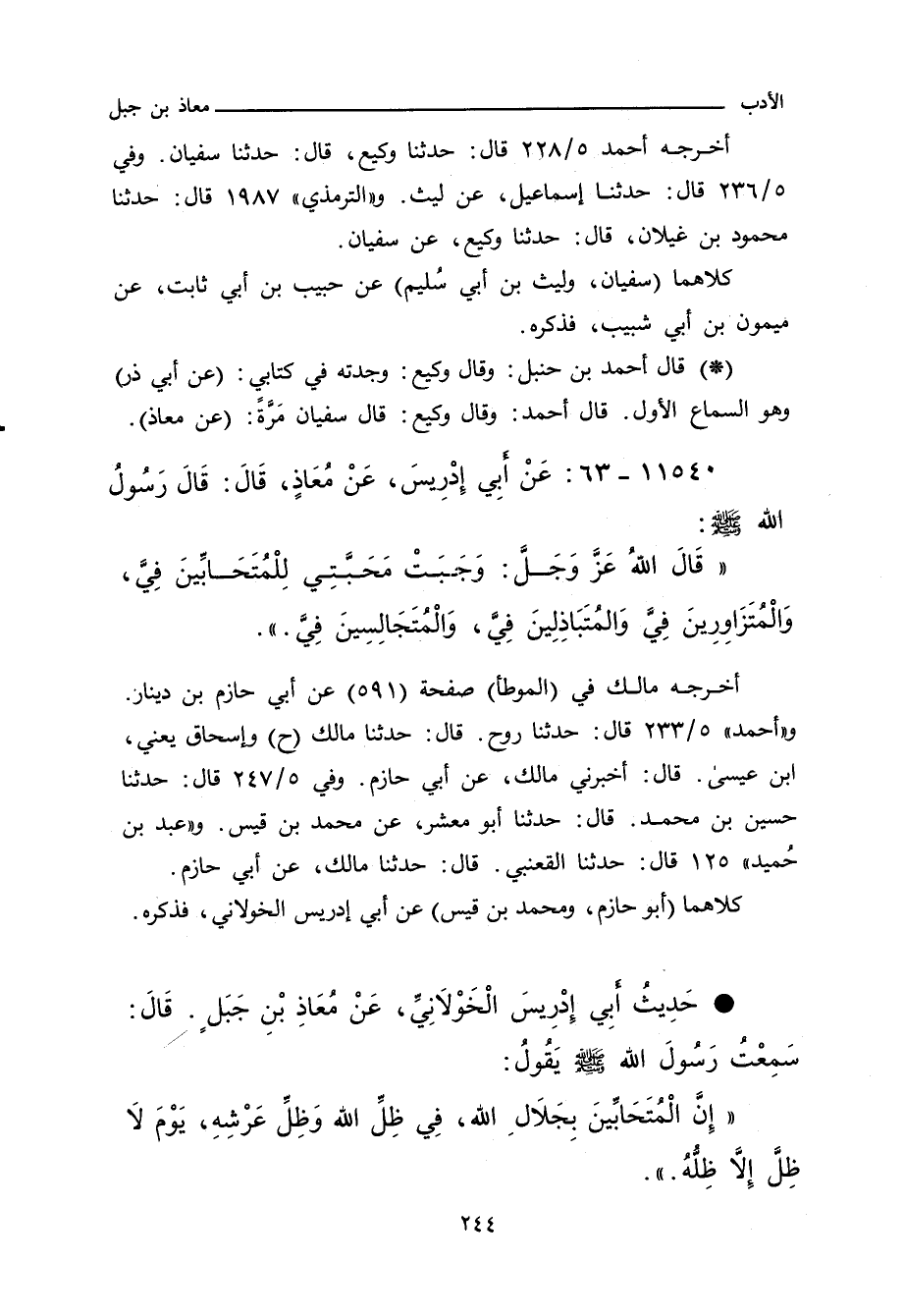 - وفي رواية: عَنْ رَسُولِ اللهِ صلى الله عليه وسلم، يَأْثُرُ عَنِ اللهِ، قَالَ: وَجَبَتْ مَحَبَّتِي لِلَّذِينَ يَتَحَابُّونَ فِيَّ، وَيَتَجَالَسُونَ فِيَّ، وَيَتَبَاذَلُونَ فِيَّ. حم (٢٢٤٨٢)