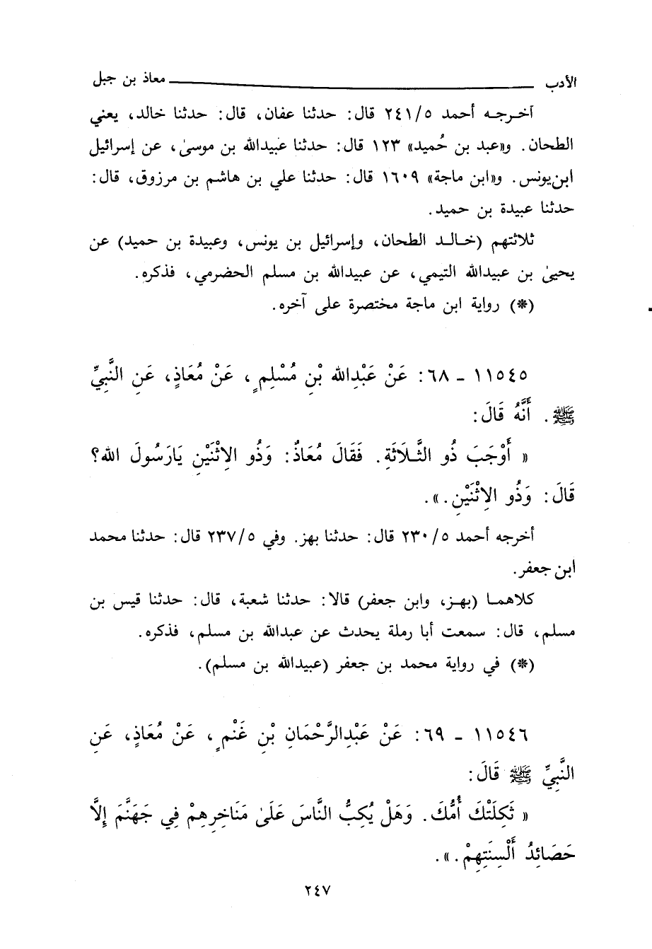 ١١٥٤٦ - عَنْ عَبْدِ الرَّحْمَانِ بْنِ غَنْمٍ، عَنْ مُعَاذٍ، عَنِ النَّبِيِّ صلى الله عليه وسلم، قَالَ: