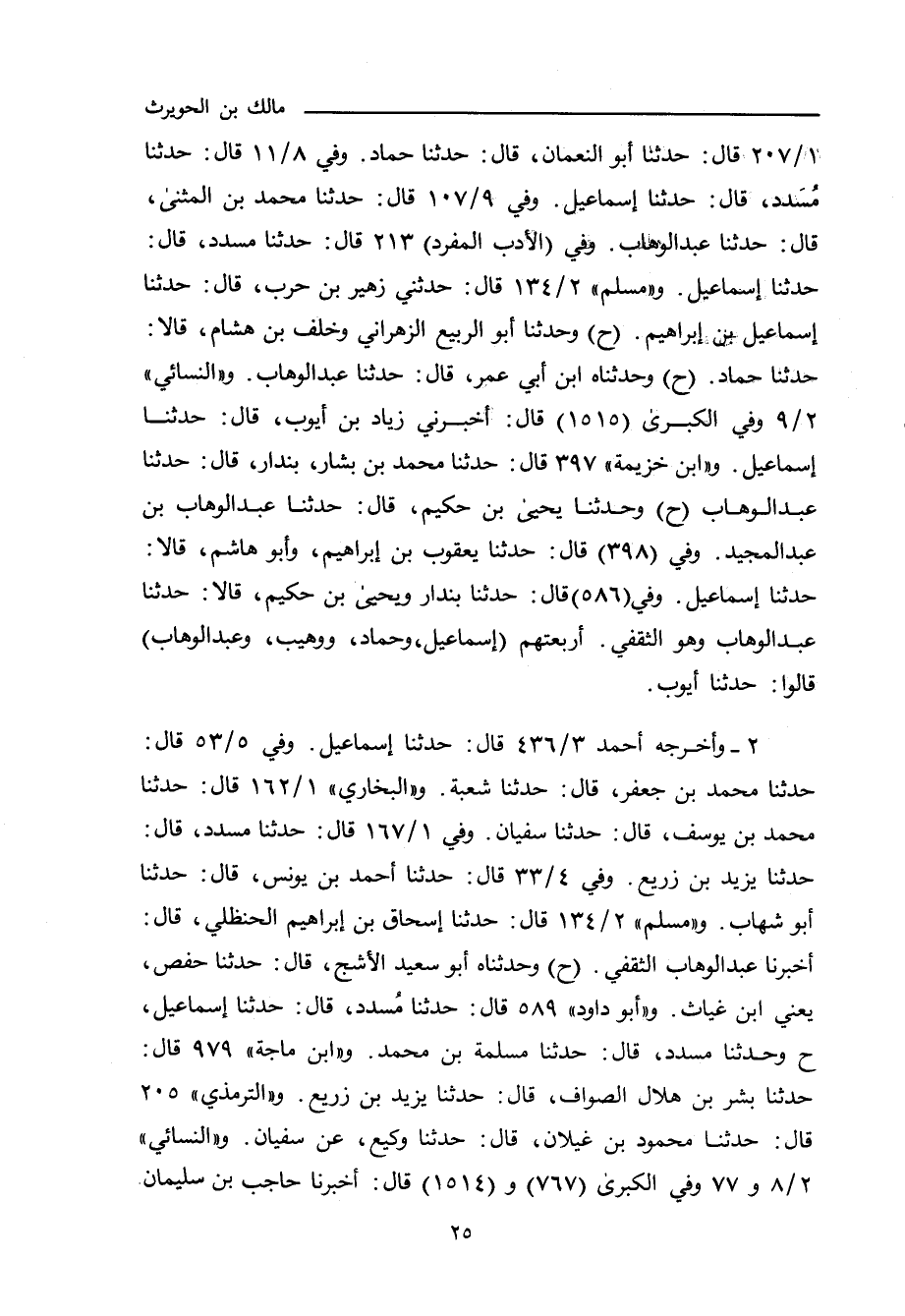 ١/ ٢٠٧ (٨١٩) قال: حدَّثنا أبو النُّعْمَان، قال: حدَّثنا حَمَّاد. وفي ٨/ ١١ (٦٠٠٨)، "الأدب المفرد" ٢١٣ قال: حدَّثنا مُسَدَّد، حدَّثنا إِسْمَاعِيل. و"مسلم"٢/ ١٣٤ (١٤٨٠) قال: حدَّثني زُهَيْر بن حَرْب، حدَّثنا إِسْمَاعِيل بن إبراهيم. وفي (١٤٨١) قال: وحدَّثنا أبو الرَّبِيع الزَّهْرَانِي، وخَلَف بن هِشَام، قالا: حدَّثنا حَمَّاد. وفي (١٤٨٢) قال: وحدَّثناه ابن أَبي عُمَر، حدَّثنا عَبْد الوَهَّاب. و"النَّسائي"٢/ ٩، وفي "الكبرى"١٦١١ قال: أخبرني زِيَاد بن أَيُّوب، قال: حدَّثنا إِسْمَاعِيل. و"ابن خزيمة"٣٩٧ قال: حدَّثنا مُحَمد بن بَشَّار، بُنْدَار، حدَّثنا عَبْد الوَهَّاب (ح) وحدَّثنا يَحيى بن حَكِيم، حدَّثنا عَبْد الوَهَّاب بن عَبْد المَجِيد. وفي (٣٩٨) قال: حدَّثنا يَعْقُوب بن إبراهيم، وأبو هاشم، قالا: حدَّثنا إِسْمَاعِيل. وفي (٥٨٦) قال: حدَّثنا بُنْدَار، ويَحيى بن حَكِيم، قالا: حدَّثنا عَبْد الوَهَّاب، وهو الثَّقَفِي.