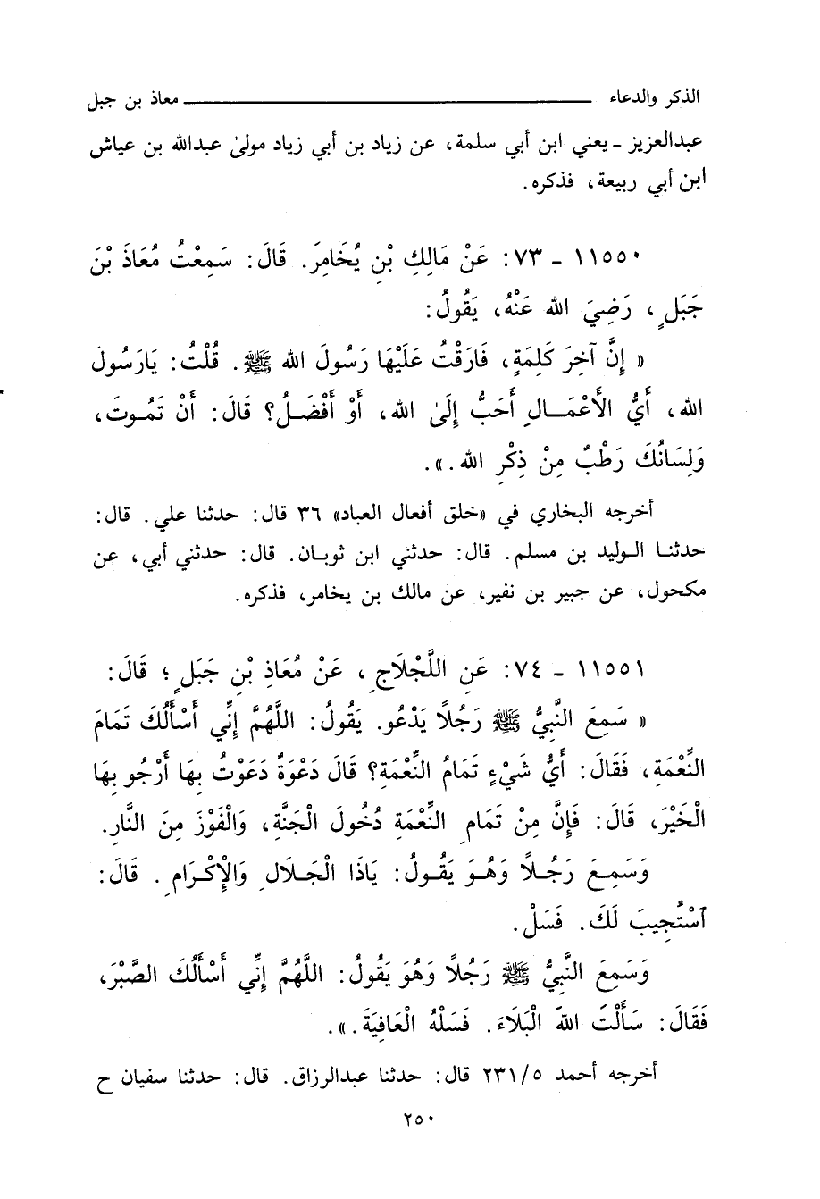١١٥٥٠ - عَنْ مَالِكِ بْنِ يَخَامِرَ، قَالَ: سَمِعْتُ مُعَاذَ بْنَ جَبَلٍ، رَضِيَ اللهُ عَنْهُ، يَقُولُ: