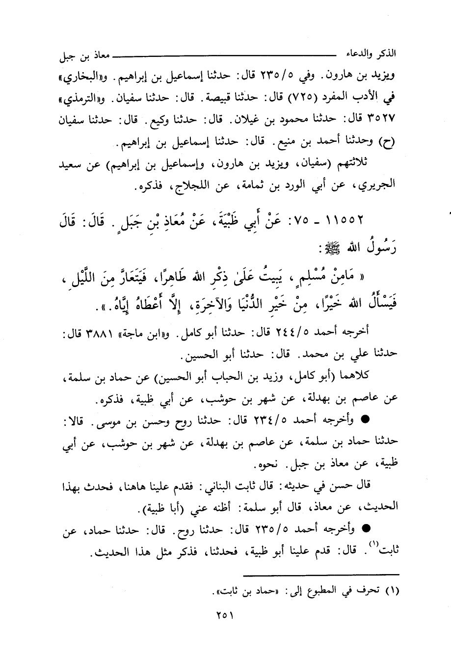 مَا مِنْ مُسْلِمٍ يَبِيتُ. ى ذِكْرٍ طَاهِرًا، فَيَتَعَارَّ مِنَ اللَّيْلِ، فَيَسْأَلُ اللهَ خَيْرًا مِنْ خَيْرِ الدُّنْيَا وَالآخِرَةِ، إِلَاّ أَعْطَاهُ إِيَّاهُ.