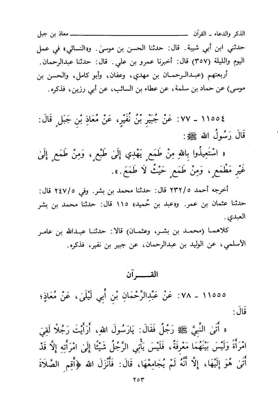 ١١٥٥٤ - عَنْ جُبَيْرِ بْنِ نُفَيْرٍ، عَنْ مُعَاذِ بْنِ جَبَلٍ، قَالَ: قَالَ لَنَا رَسُولُ اللهِ صلى الله عليه وسلم:
