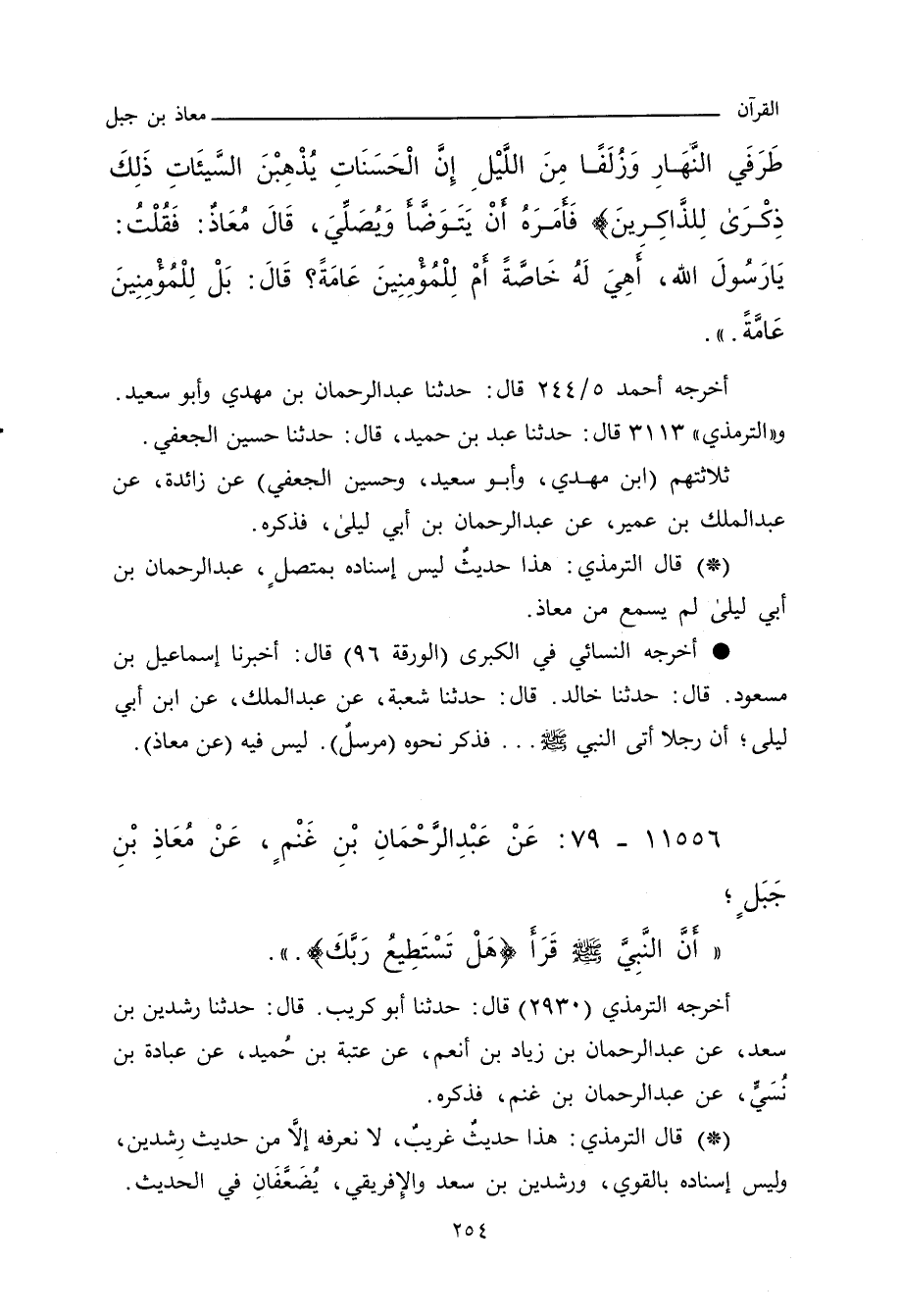 طَرَفَيِ النَّهَارِ وَزُلَفًا مِنَ اللَّيْلِ إِنَّ الْحَسَنَاتِ يُذْهِبْنَ السِّيِّئَاتِ ذَلِكَ ذِكْرَى لِلذَّاكِرِينَ) فَأَمَرَهُ أَنْ يَتَوَضَّأَ وَيُصَلِّيَ، قَالَ مُعَاذٌ: فَقُلْتُ: يَا رَسُولَ اللهِ، أَهِيَ لَهُ خَاصَّةً أَمْ لِلْمُؤْمِنِينَ عَامَّةً؟ قَالَ: بَلْ لِلْمُؤْمِنِينَ عَامَّةً.