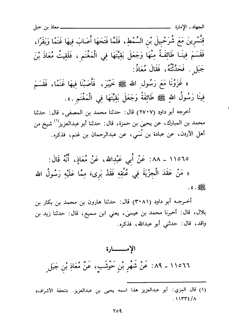 أخرجه أبو داود (٢٧٠٧) قال: حدَّثنا مُحَمد بن المُصَفَّى , حدَّثنا مُحَمد بن المُبَارَك , عن يَحيى بن حَمْزَة , قال: حدَّثنا أبو عَبْد العَزِيز، شَيْخ من أهل الأُردن , عن عُبَادَة بن نُسَي, عن عَبْد الرَّحْمان بن غَنْم , فذكره.