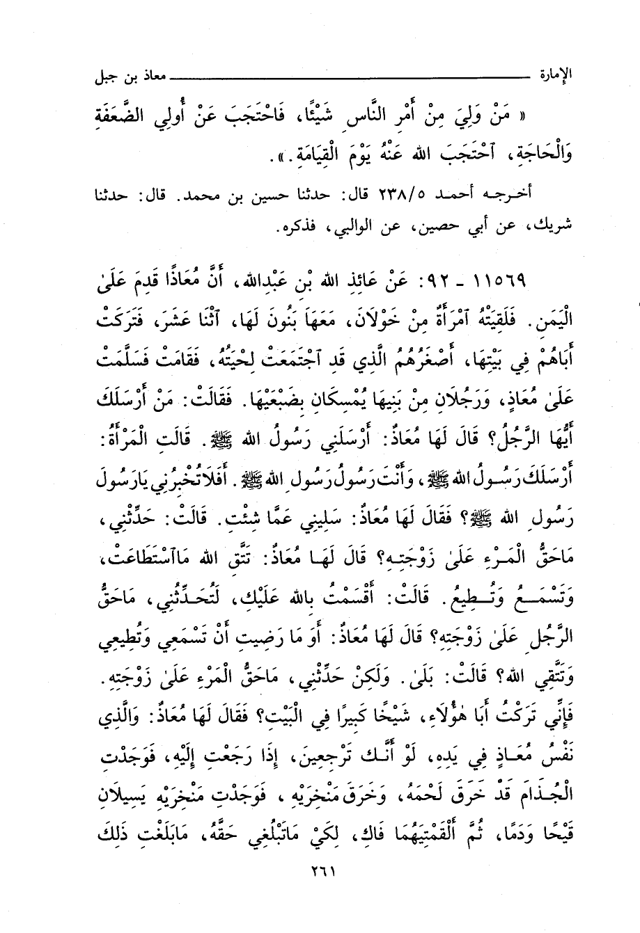 ١١٥٦٩ - عَنْ عَائِذِ اللهِ بْنِ عَبْدِ اللهِ، أَنَّ مُعَاذًا قَدِمَ. يْهِمُ الْيَمَنِ، فَلَقِيَتْهُ امْرَأَةٌ مِنْ خَوْلَانَ، مَعَهَا بَنُونَ لَهَا، اثْنَا عَشَرَ، فَتَرَكَتْ أَبَاهُمْ فِي بَيْتِهَا، أَصْغَرُهُمُ الَّذِي قَدِ اجْتَمَعَتْ لِحْيَتُهُ، فَقَامَتْ فَسَلَّمَتْ. ى مُعَاذٍ، وَرَجُلَانِ مِنْ بَنِيهَا يَمْسِكَانِ بِضَبْعَيْهَا، فَقَالَتْ: مَنْ أَرْسَلَكَ أَيُّهَا الرَّجُلُ؟ قَالَ لَهَا مُعَاذٌ: أَرْسَلَنِي رَسُولُ اللهِ صلى الله عليه وسلم، قَالَتِ الْمَرْأَةُ: أَرْسَلَكَ رَسُولُ اللهِ صلى الله عليه وسلم، وَأَنْتَ رَسُولُ رَسُولِ اللهِ صلى الله عليه وسلم، أَفَلَا تُخْبِرُنِي يَا رَسُولَ رَسُولِ اللهِ صلى الله عليه وسلم؟ فَقَالَ لَهَا مُعَاذٌ: سَلِينِي عَمَّا شِئْتِ، قَالَتْ: حَدِّثْنِي مَا حَقُّ الْمَرْءِ. ى زَوْجَتِهِ؟ قَالَ لَهَا مُعَاذٌ: تَتَّقِي اللهَ مَا اسْتَطَاعَتْ، وَتَسْمَعُ وَتُطِيعُ، قَالَتْ: أَقْسَمْتُ بِاللهِ. يْكَ، لَتُحَدِّثَنِّي مَا حَقُّ الرَّجُلِ. ى زَوْجَتِهِ؟ قَالَ لَهَا مُعَاذٌ: أَوَ مَا رَضِيتِ أَنْ تَسْمَعِي وَتُطِيعِي وَتَتَّقِي اللهَ؟ قَالَتْ: بَلَى، وَلَكِنْ حَدِّثْنِي مَا حَقُّ الْمَرْءِ. ى زَوْجَتِهِ، فَإِنِّي تَرَكْتُ أَبَا هَؤُلَاءِ شَيْخًا كَبِيرًا فِي الْبَيْتِ، فَقَالَ لَهَا مُعَاذٌ: وَالَّذِي نَفْسُ مُعَاذٍ فِي يَدِهِ، لَوْ أَنَّكِ تَرْجِعِينَ إِذَا رَجَعْتِ إِلَيْهِ، فَوَجَدْتِ الْجُذَامَ قَدْ خَرَقَ لَحْمَهُ، وَخَرَقَ مِنْخَرَيْهِ، فَوَجَدْتِ مِنْخَرَيْهِ يَسِيلَانِ قَيْحًا وَدَمًا، ثُمَّ أَلْقَمْتِيهِمَا فَاكِ، لِكَيْمَا تَبْلُغِي حَقَّهُ، مَا بَلَغْتِ ذَلِكَ