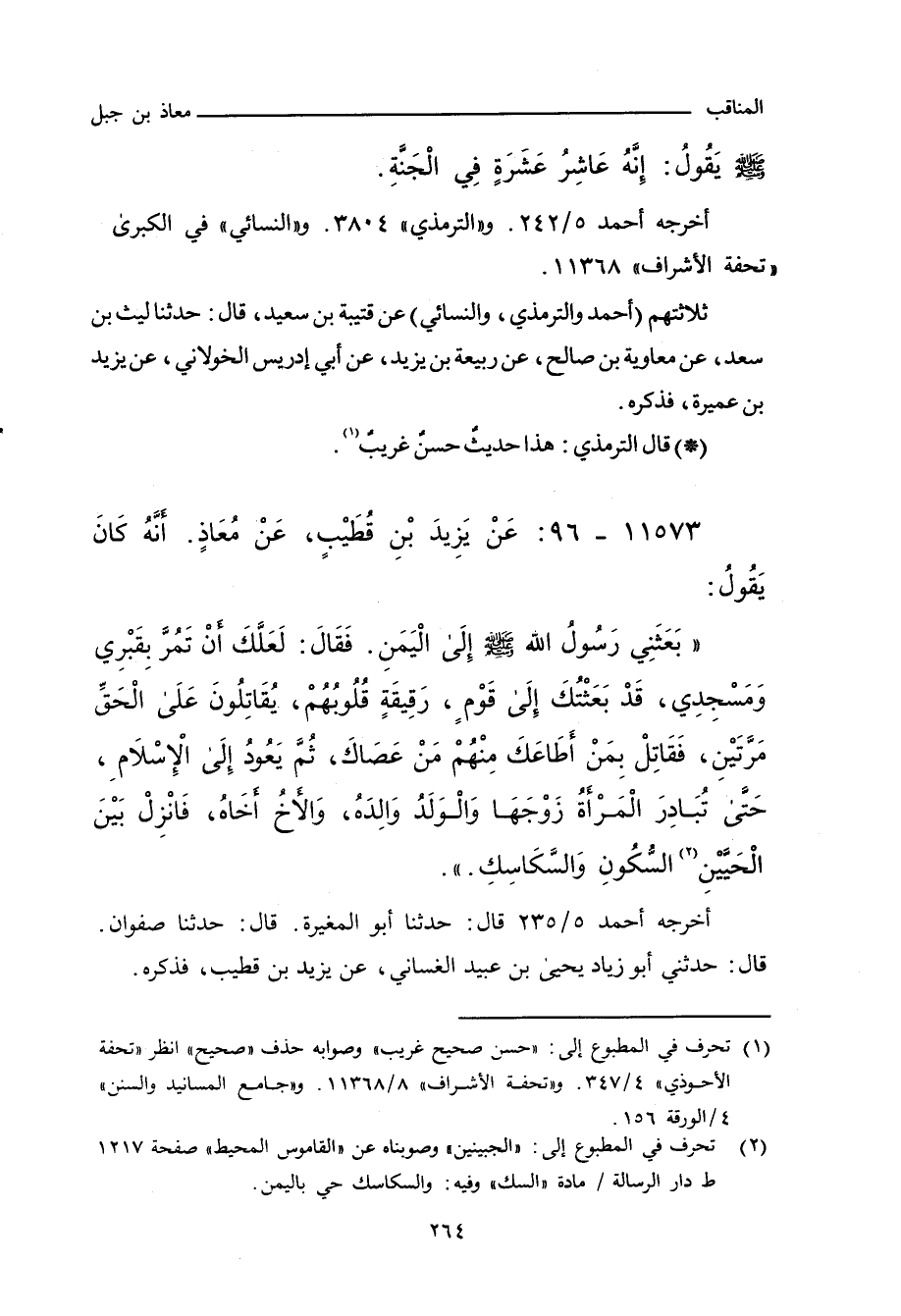 ثلاثتهم (أحمد، والترمزي، والنَّسَائِي) عن مُعَاوِية بن صالح، عن رَبِيعَة بن يَزِيد، عن أَبي إِدْرِيس الخَوْلَانِي، عن يَزِيد بن عَمِيرَة، فذكره.