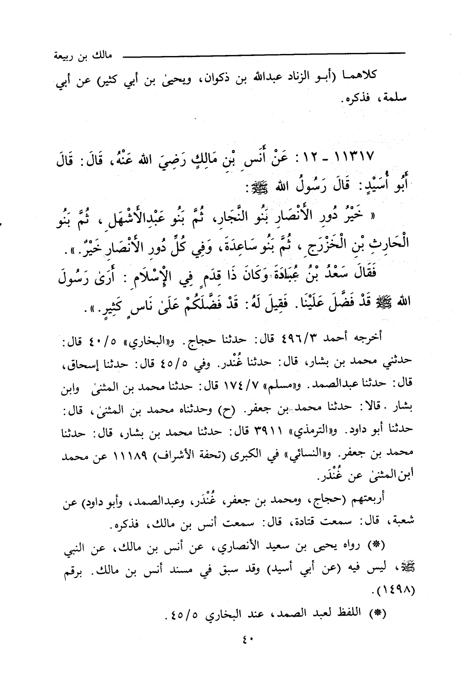 خَيْرُ دُورِ الأَنْصَارِ: بَنُو النَّجَّارِ، ثُمَّ بَنُو عَبْدِ الأَشْهَلِ، ثُمَّ بَنُو الْحَارِثِ بْنِ الْخَزْرَجِ، ثُمَّ بَنُو سَاعِدَةَ، وَفِي كُلِّ دُورِ الأَنْصَارِ خَيْرٌ.