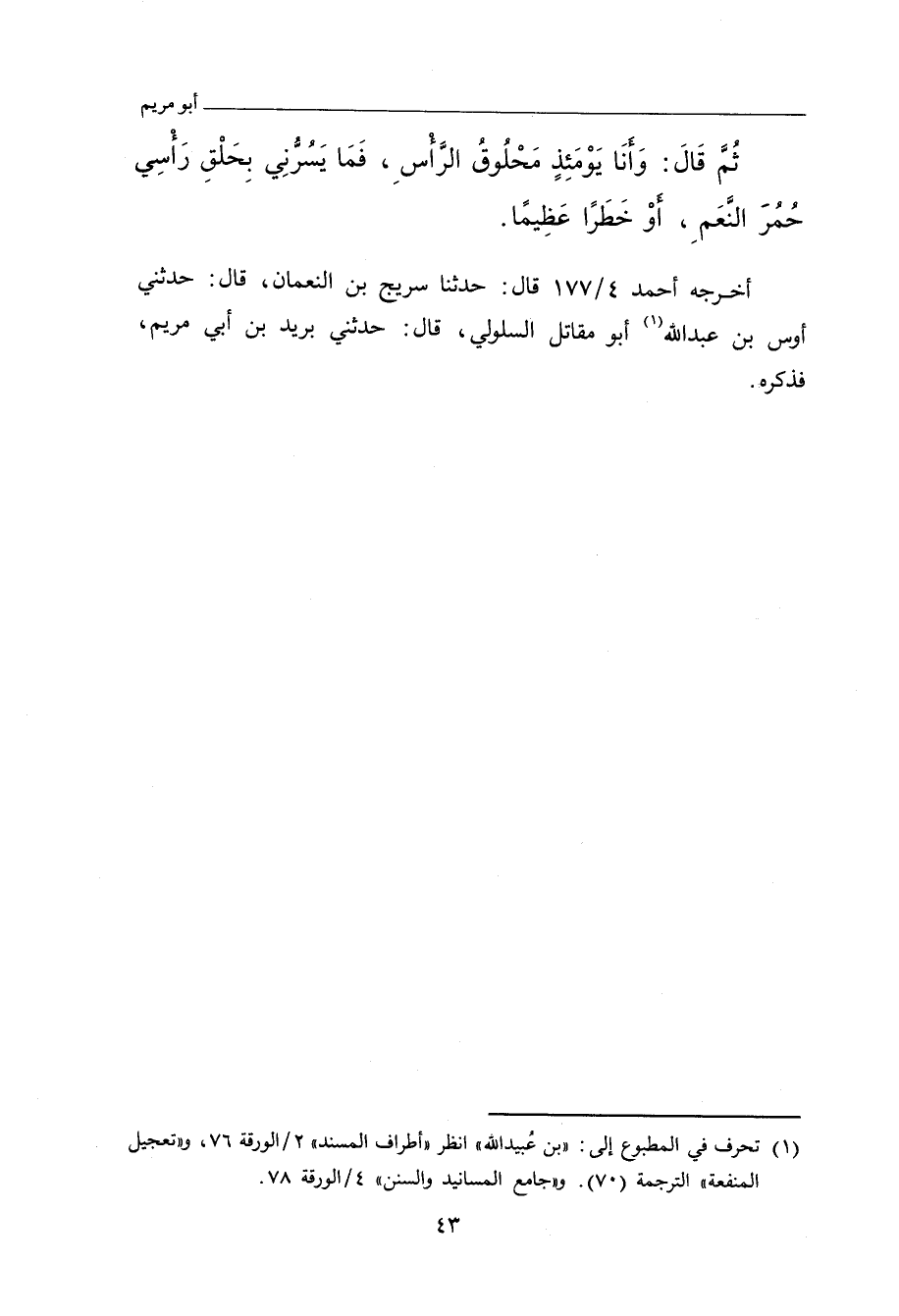 ثُمَّ قَالَ: وَأَنَا يَوْمَئِذٍ مَحْلُوقُ الرَّأْسِ، فَمَا يَسُرُّنِي بِحَلْقِ رَأْسِي حُمْرَ النَّعَمِ، أَوْ خَطَرًا عَظِيمًا.