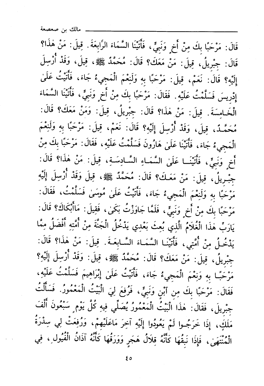 هَذَا؟ قِيلَ: جِبْرِيلُ، قِيلَ: مَنْ مَعَكَ؟ قِيلَ: مُحَمَّدٌ صلى الله عليه وسلم، قِيلَ: وَقَدْ أُرْسِلَ إِلَيْهِ؟ قِيلَ: نَعَمْ، قِيلَ: مَرْحَبًا بِهِ، وَلَنِعْمَ الْمَجِيءُ جَاءَ، فَأَتَيْتُ عَلَى إِدْرِيسَ فَسَلَّمْتُ عَلَيْهِ، فَقَالَ: مَرْحَبًا مِنْ أَخٍ وَنَبِيٍّ، فَأَتَيْنَا السَّمَاءَ الْخَامِسَةَ، قِيلَ: مَنْ هَذَا؟ قَالَ: جِبْرِيلُ، قِيلَ: وَمَنْ مَعَكَ؟ قِيلَ: مُحَمَّدٌ، قِيلَ: وَقَدْ أُرْسِلَ إِلَيْهِ؟ قَالَ: نَعَمْ، قِيلَ: مَرْحَبًا بِهِ، وَلَنِعْمَ الْمَجِيءُ جَاءَ، فَأَتَيْنَا عَلَى هَارُونَ، فَسَلَّمْتُ عَلَيْهِ، فَقَالَ: مَرْحَبًا بِكَ مِنْ أَخٍ وَنَبِيٍّ، فَأَتَيْنَا عَلَى السَّمَاءِ السَّادِسَةِ، قِيلَ: مَنْ هَذَا؟ قِيلَ: جِبْرِيلُ، قِيلَ: مَنْ مَعَكَ؟ قِيلَ: مُحَمَّدٌ صلى الله عليه وسلم، قِيلَ: وَقَدْ أُرْسِلَ إِلَيْهِ؟ مَرْحَبًا بِهِ، وَلَنِعْمَ الْمَجِيءُ جَاءَ، فَأَتَيْتُ عَلَى مُوسَى، فَسَلَّمْتُ عَلَيْهِ، فَقَالَ: مَرْحَبًا بِكَ مِنْ أَخٍ وَنَبِيٍّ، فَلَمَّا جَاوَزْتُ بَكَى، فَقِيلَ: مَا أَبْكَاكَ؟ قَالَ: يَا رَبِّ، هَذَا الْغُلَامُ الَّذِي بُعِثَ بَعْدِي، يَدْخُلُ الْجَنَّةَ مِنْ أُمَّتِهِ أَفْضَلُ مِمَّا يَدْخُلُ مِنْ أُمَّتِي، فَأَتَيْنَا السَّمَاءَ السَّابِعَةَ، قِيلَ: مَنْ هَذَا؟ قِيلَ: جِبْرِيلُ، قِيلَ: مَنْ مَعَكَ؟ قِيلَ: مُحَمَّدٌ، قِيلَ: وَقَدْ أُرْسِلَ إِلَيْهِ؟ مَرْحَبًا بِهِ، وَنِعْمَ الْمَجِيءُ جَاءَ، فَأَتَيْتُ عَلَى إِبْرَاهِيمَ، فَسَلَّمْتُ عَلَيْهِ، فَقَالَ: مَرْحَبًا بِكَ مِنِ ابْنٍ وَنَبِيٍّ، فَرُفِعَ لِيَ الْبَيْتُ الْمَعْمُورُ، فَسَأَلْتُ جِبْرِيلَ، فَقَالَ: هَذَا الْبَيْتُ الْمَعْمُورُ، يُصَلِّي فِيهِ كُلَّ يَوْمٍ سَبْعُونَ أَلْفَ مَلَكٍ، إِذَا