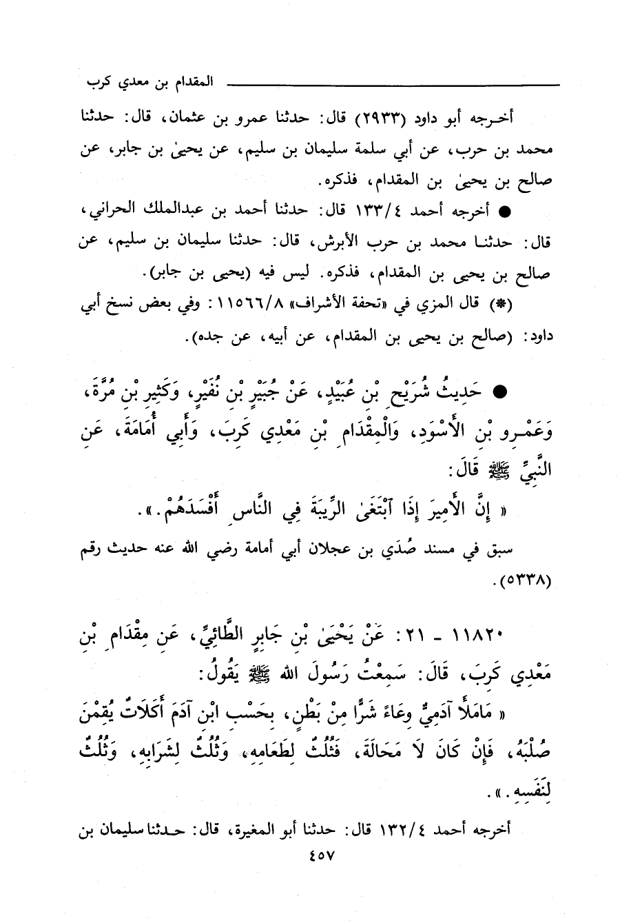 ١١٨٢٠ - عَنْ يَحْيَى بْنِ جَابِرٍ الطَّائِيِّ، قَالَ: سَمِعْتُ الْمِقْدَامَ بْنَ مَعْدِي كَرِبَ الْكِنْدِيَّ، قَالَ: سَمِعْتُ رَسُولَ اللهِ صلى الله عليه وسلم يَقُولُ: