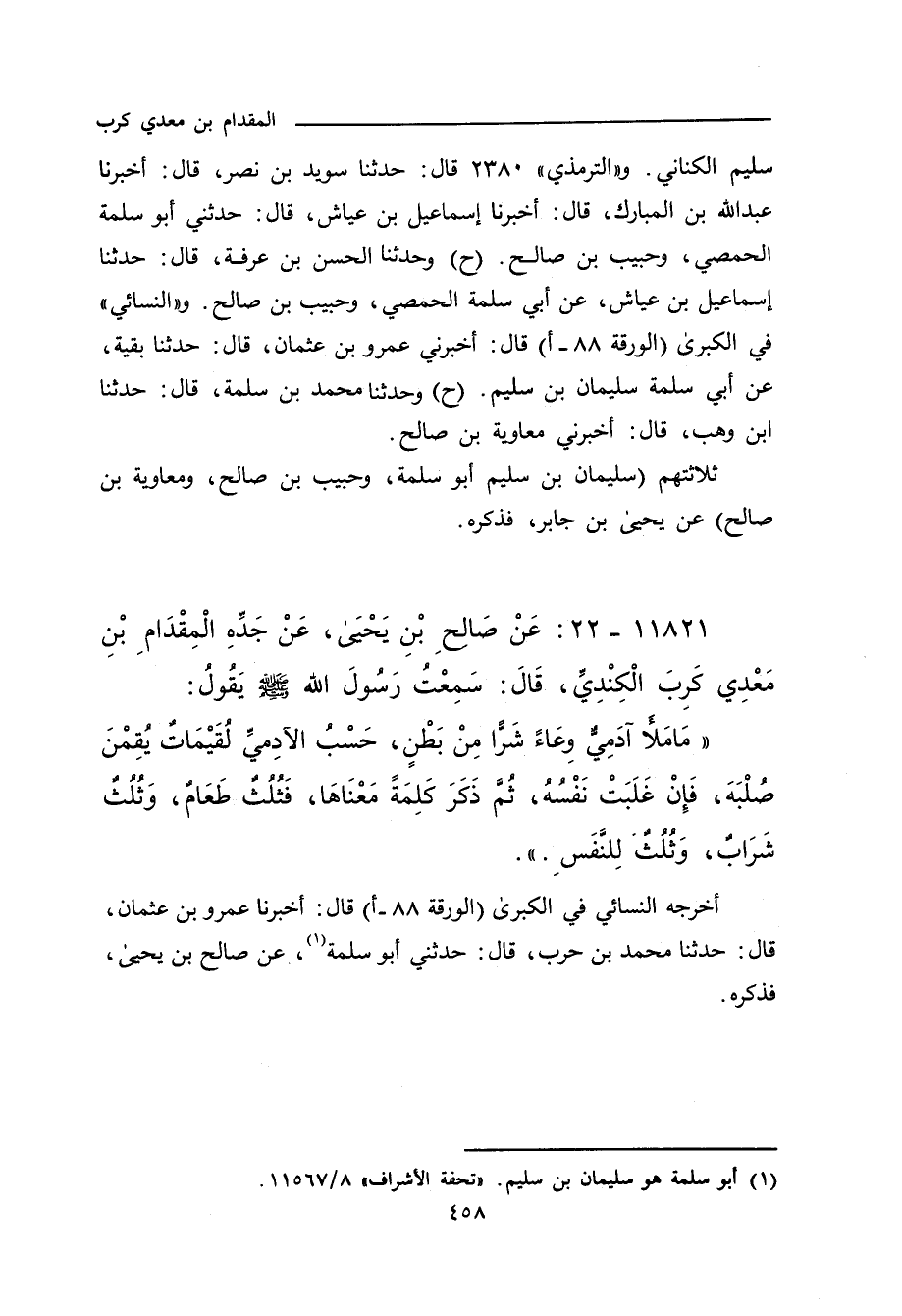 ١١٨٢١ - عَنْ صَالِحِ بْنِ يَحْيَى، عَنْ جَدِّهِ الْمِقْدَامِ بْنِ مَعْدِي كَرِبَ الْكِنْدِيَّ، قَالَ: سَمِعْتُ رَسُولَ اللهِ صلى الله عليه وسلم يَقُولُ:
