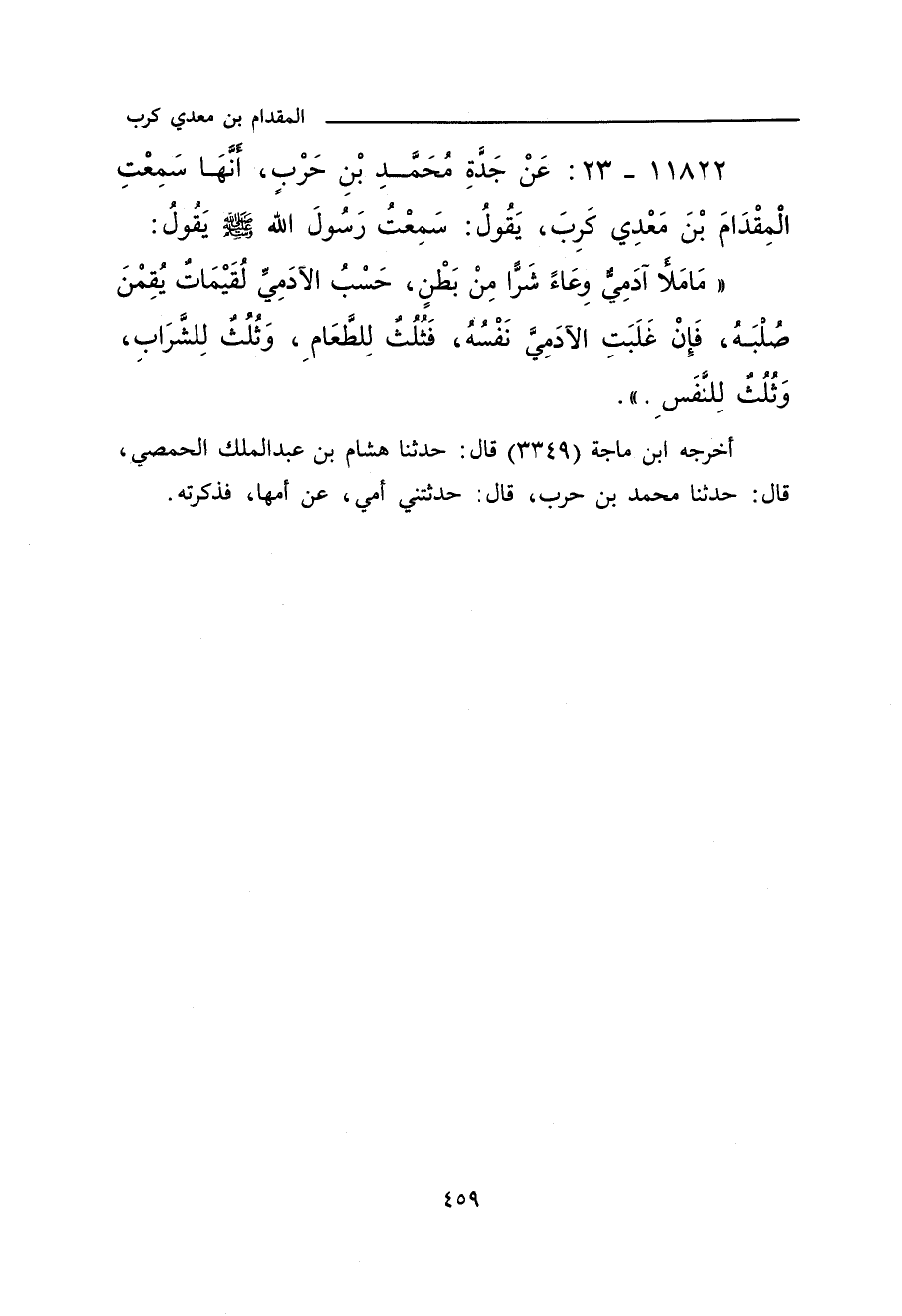 مَا مَلأَ آدَمِيٌّ وِعَاءً شَرًّا مِنْ بَطْنٍ، حَسْبُ الآدَمِيِّ لُقَيْمَاتٌ يُقِمْنَ صُلْبَهُ، فَإِنْ غَلَبَتِ الآدَمِيَّ نَفْسُهُ، فَثُلُثٌ لِلطَّعَامِ، وَثُلُثٌ لِلشَّرَابِ، وَثُلُثٌ لِلنَّفَسِ.