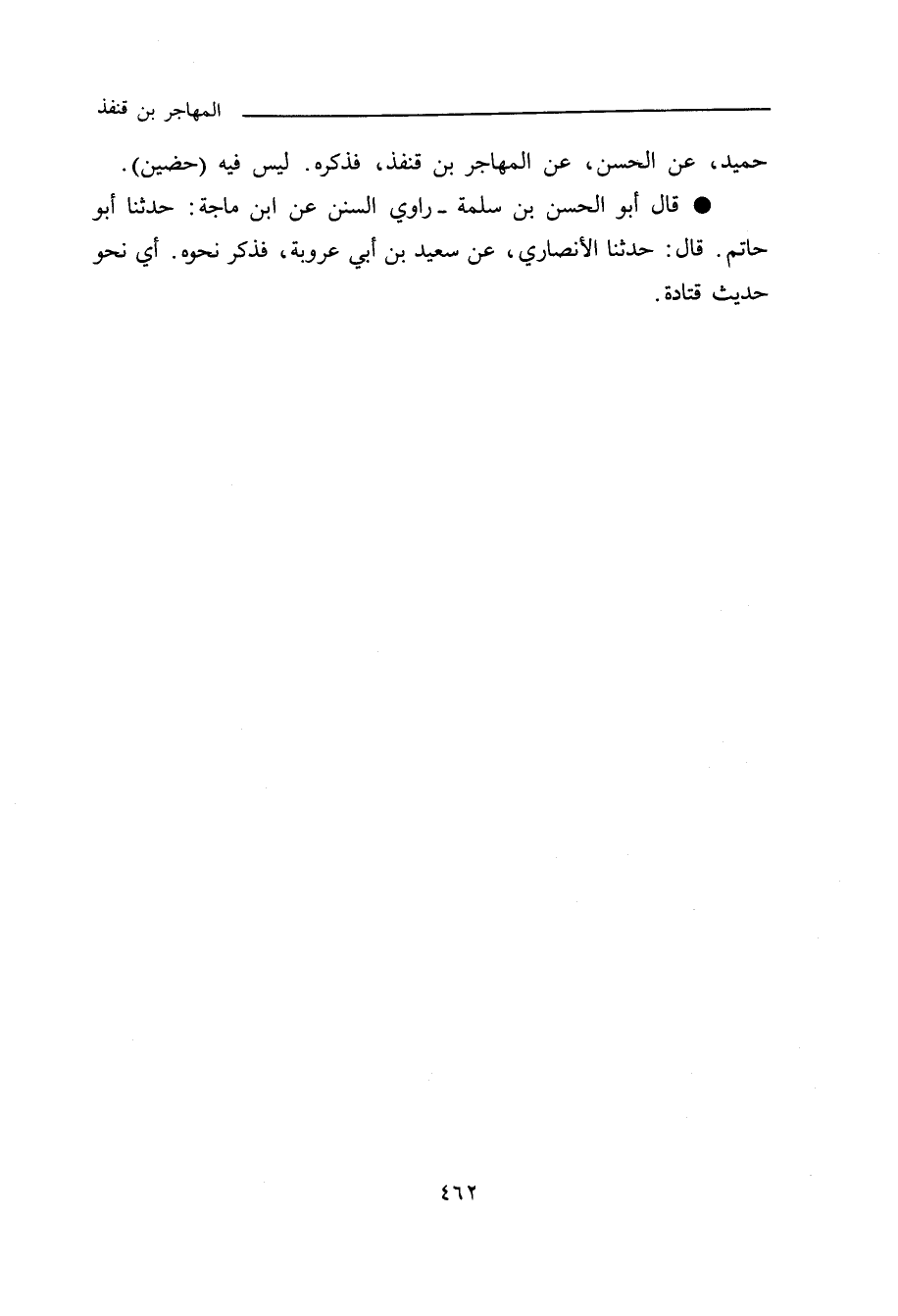 كلاهما (جَرِير، وحُمَيْد) عن الحَسَنِ، عَنِ الْمُهَاجِرِ بْنِ قُنْفُذ، فذكره ليس فيه: حُضَيْن".
