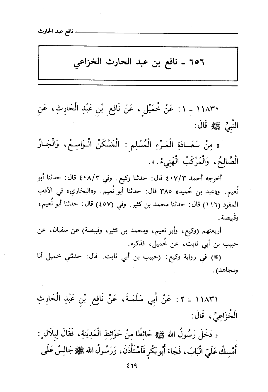 ١١٨٣٠ - عَنْ خُمَيْلٍ، عَنْ نَافِعِ بْنِ عَبْدِ الْحَارِثِ، عَنِ النَّبِيِّ صلى الله عليه وسلم، قَالَ: