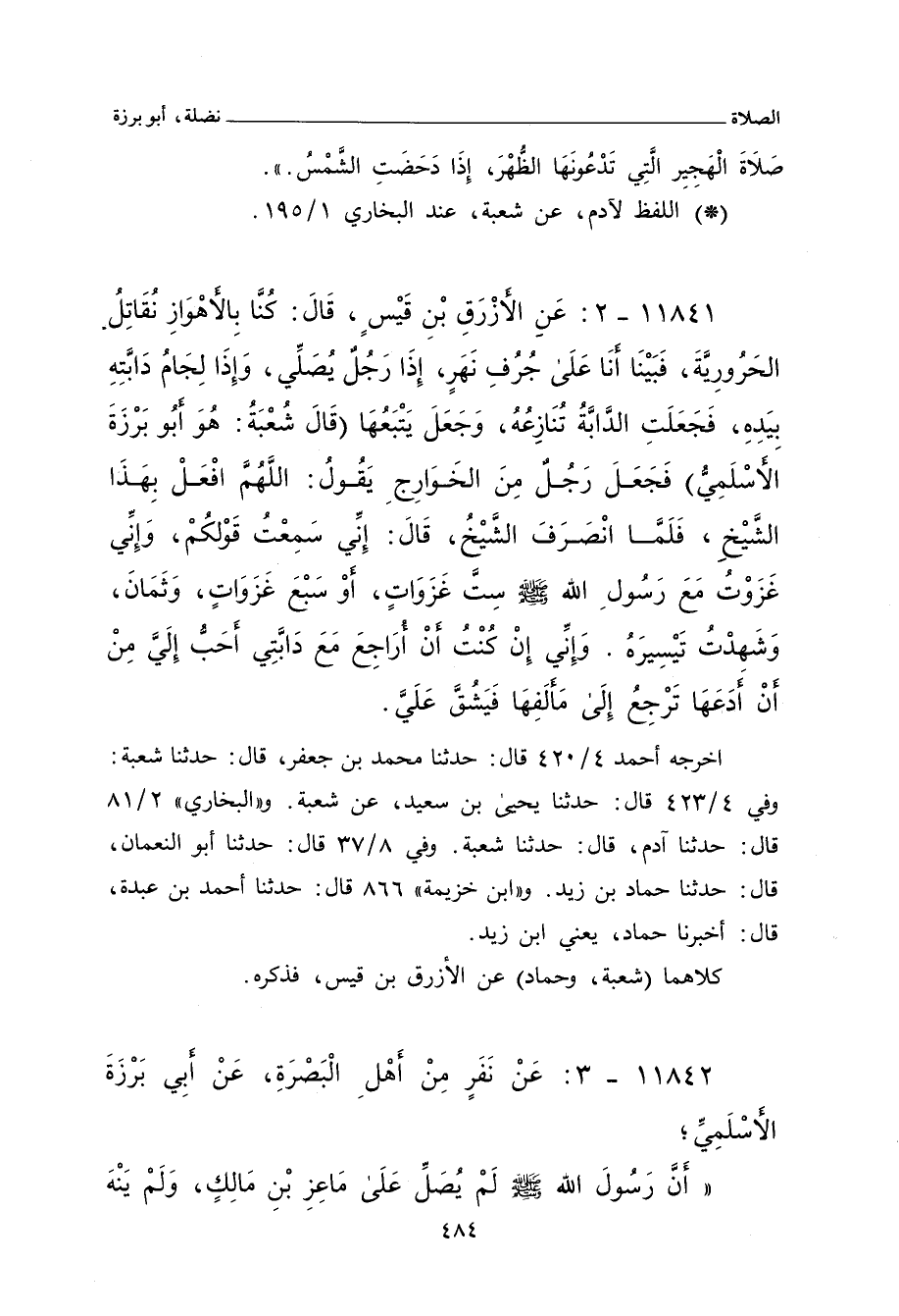 ١١٨٤١ - عَنِ الأَزْرَقِ بْنِ قَيْسٍ، قَالَ: كُنَّا بِالأَهْوَازِ نُقَاتِلُ الْحَرُورِيَّةَ، فَبَيْنَا أَنَا عَلَى جُرُفِ نَهَرٍ، إِذَا رَجُلٌ يُصَلِّى، وَإِذَا لِجَامُ دَابَّتِهِ بِيَدِهِ، فَجَعَلَتِ الدَّابَّةُ تُنَازِعُهُ، وَجَعَلَ يَتْبَعُهَا - قَالَ شُعْبَةُ: هُوَ أَبُو بَرْزَةَ الأَسْلَمِيُّ - فَجَعَلَ رَجُلٌ مِنَ الْخَوَارِجِ يَقُولُ: اللَّهُمَّ افْعَلْ بِهَذَا الشَّيْخِ، فَلَمَّا انْصَرَفَ الشَّيْخُ، قَالَ: إِنِّي سَمِعْتُ قَوْلَكُمْ (وَإِنِّي غَزَوْتُ مَعَ رَسُولِ اللهِ صلى الله عليه وسلم سِتَّ غَزَوَاتٍ، أَوْ سَبْعَ غَزَوَاتٍ، وَثَمَانَ، وَشَهِدْتُ تَيْسِيرَهُ، وَإِنِّي أَنْ كُنْتُ أَنْ أُرَاجِعَ مَعَ دَابَّتِي أَحَبُّ إِلَيَّ مِنْ أَنْ أَدَعَهَا تَرْجِعُ إِلَى مَأْلَفِهَا فَيَشُقَّ عَلَيَّ.