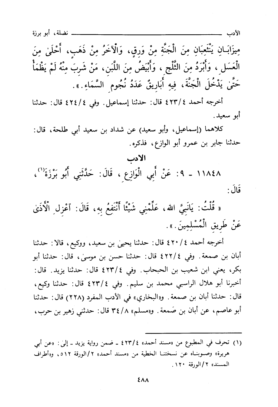 أخرجه أحمد ٤/ ٤٢٣ (٢٠٠٣٣) قال: حدَّثنا إسماعيل. وفي ٤/ ٤٢٤ (٢٠٠٤٠ و ٢٠٠٤١ و ٢٠٠٤٢) قال: حدَّثنا أبو سعيد. حب (٦٤٥٨) قال: أَخْبَرنا أحمد بن محمد بن الحسن، حدثنا أحمد بن منصور زاج، حدثنا النضر بن شميل.