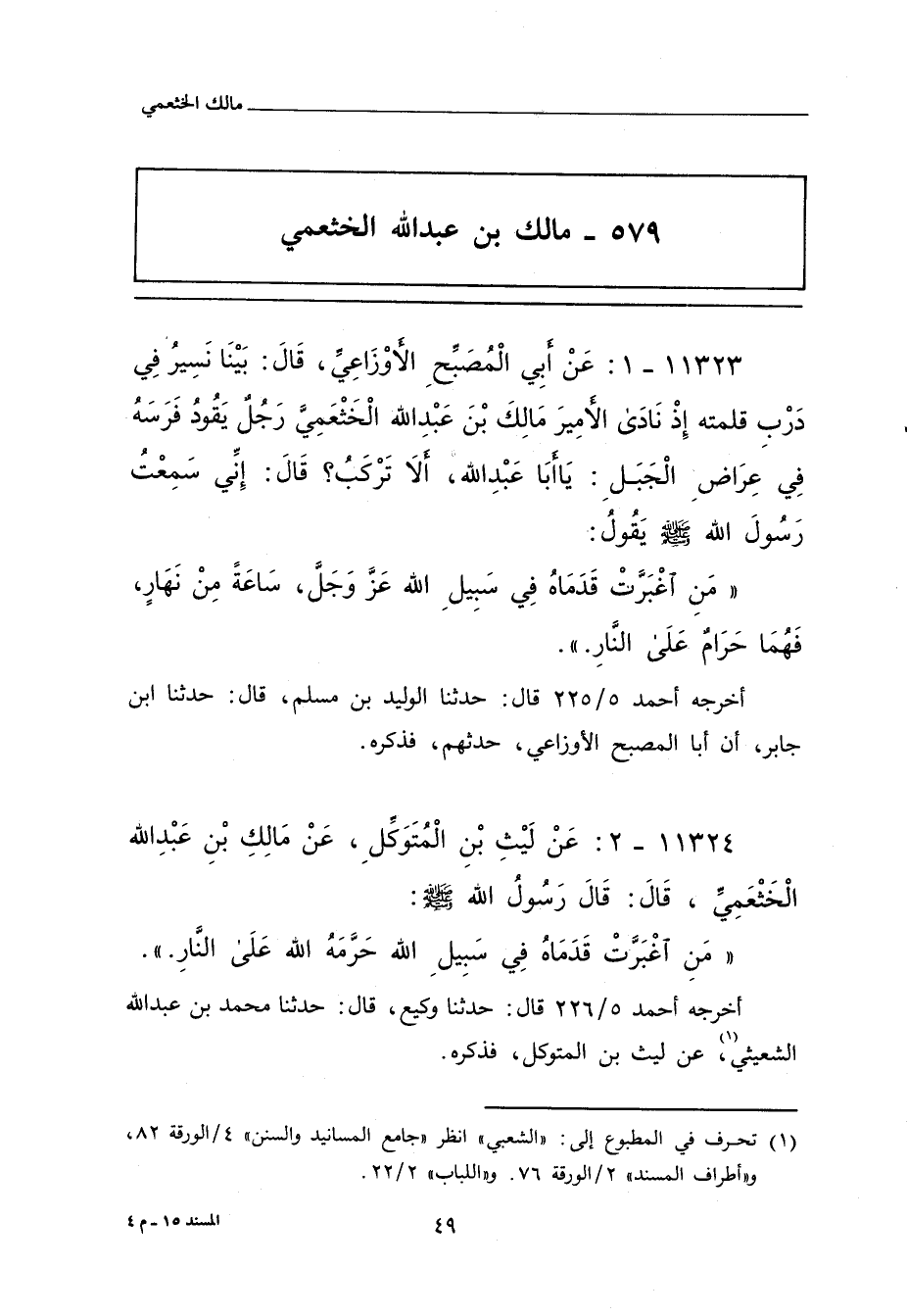 ١١٣٢٣ - عَنْ أَبيِ الْمُصْبِّحِ الأَوْزَاعِيُّ، قَالَ: بَيْنَا نَسِيرُ فِي دَرْبِ قَلَمْيَةَ، إِذْ نَادَى الأَمِيرُ مَالِكُ بْنُ عَبْدِ اللهِ الْخَثْعَمِيُّ رَجُلاً يَقُودُ فَرَسَهُ فِي عِرَاضَ الْجَبَلِ: يَا أَبَا عَبْدِ اللهِ، أَلَا تَرْكَبُ؟ قَالَ: إِنِّي سَمِعْتُ رَسُولَ اللهِ صلى الله عليه وسلم يَقُولُ: