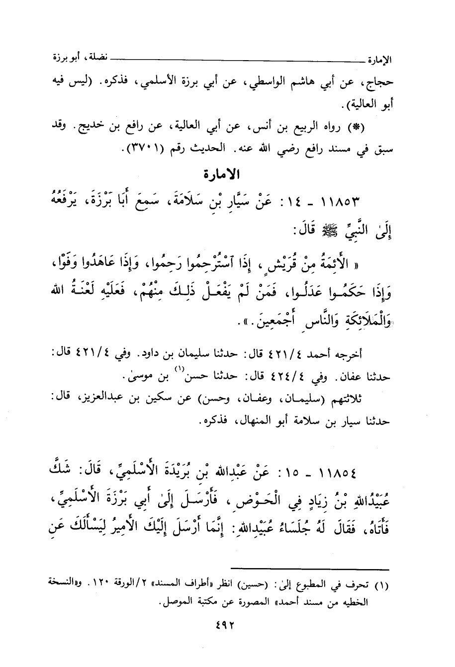 الأَئِمَّةُ مِنْ قُرَيْشٍ، إِذَا اسْتُرْحِمُوا رَحِمُوا، وَإِذَا عَاهَدُوا وَفَوْا، وَإِذَا حَكَمُوا عَدَلُوا، فَمَنْ لَمْ يَفْعَلْ ذَلِكَ مِنْهُمْ، فَعَلَيْهِ لَعْنَةُ اللهِ وَالْمَلَائِكَةِ وَالنَّاسِ أَجْمَعِينَ. حم (٢٠٠١٥)