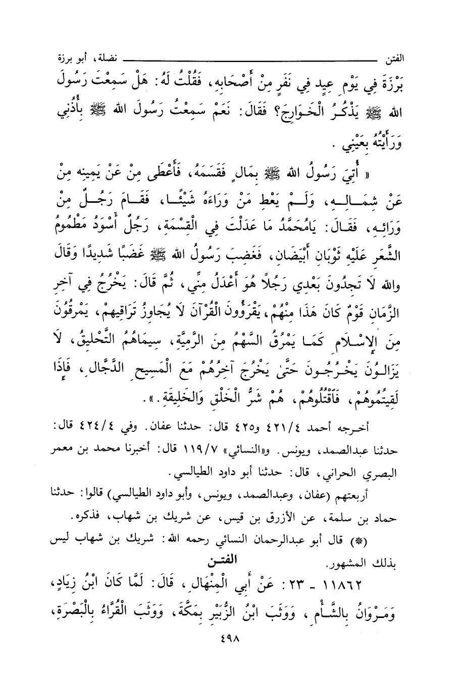 بَرْزَةَ فِي يَوْمِ عِيدٍ، فِي نَفَرٍ مِنْ أَصْحَابِهِ، فَقُلْتُ لَهُ: هَلْ سَمِعْتَ رَسُولَ اللهِ صلى الله عليه وسلم يَذْكُرُ الْخَوَارِجَ؟ فَقَالَ: نَعَمْ سَمِعْتُ رَسُولَ اللهِ صلى الله عليه وسلم بِأُذُنِي، وَرَأَيْتُهُ بَعَيْنِي؛
