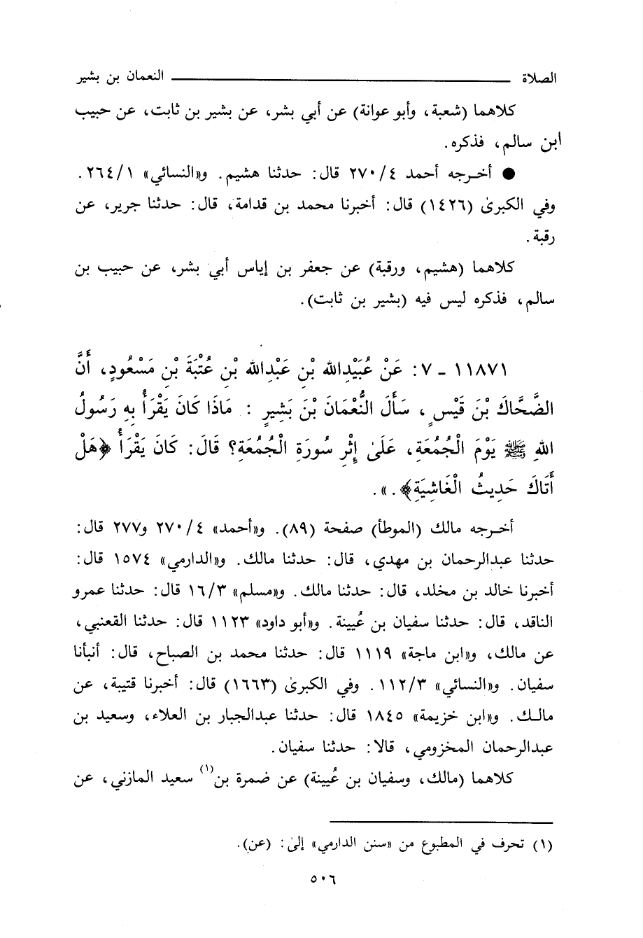 ١١٨٧١ - عَنْ عُبَيْدِ اللهِ بْنِ عَبْدِ اللهِ بْنِ عُتْبَةَ بْنِ مَسْعُودٍ، أَنَّ الضَّحَّاكَ بْنَ قَيْسٍ سَأَلَ النُّعْمَانَ بْنَ بَشِيرٍ: مَاذَا كَانَ يَقْرَأُ بِهِ رَسُولُ اللهِ صلى الله عليه وسلم يَوْمَ الْجُمُعَةِ، عَلَى إِثْرِ سُورَةِ الْجُمُعَةِ؟ قَالَ: كَانَ يَقْرَأُ: "هَلْ أَتَاكَ حَدِيثُ الْغَاشِيَةِ". ط
