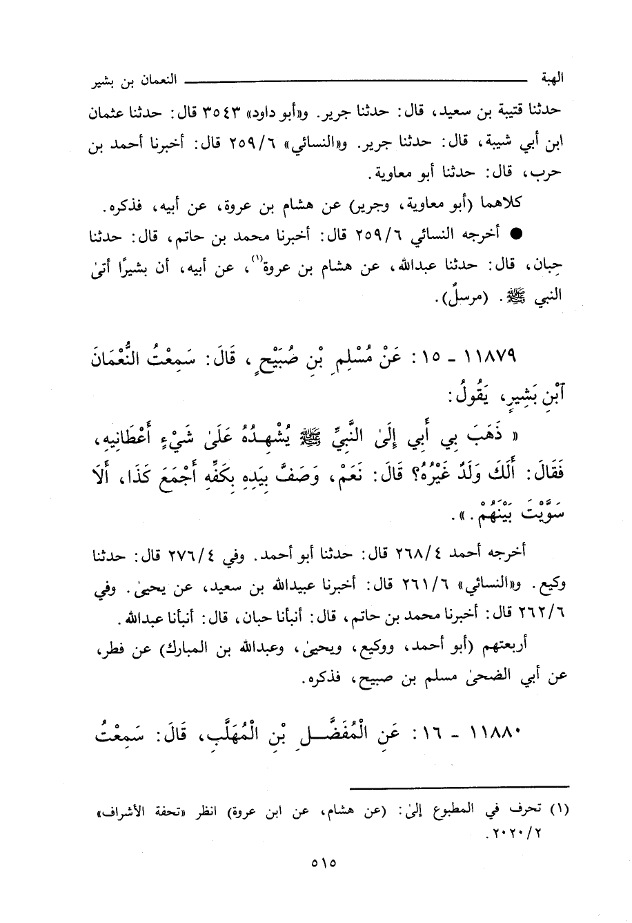 أَنَّ بَشِيرًا أَتَى النَّبِيَّ صلى الله عليه وسلم، فَقَالَ: يَا نَبِيَّ اللهِ، نَحَلْتُ النُّعْمَانَ نِحْلَةً، قَالَ: أَعْطَيْتَ لإِخْوَتِهِ؟ قَالَ: لَا، قَالَ: فَارْدُدْهُ. مُرْسَلٌ.