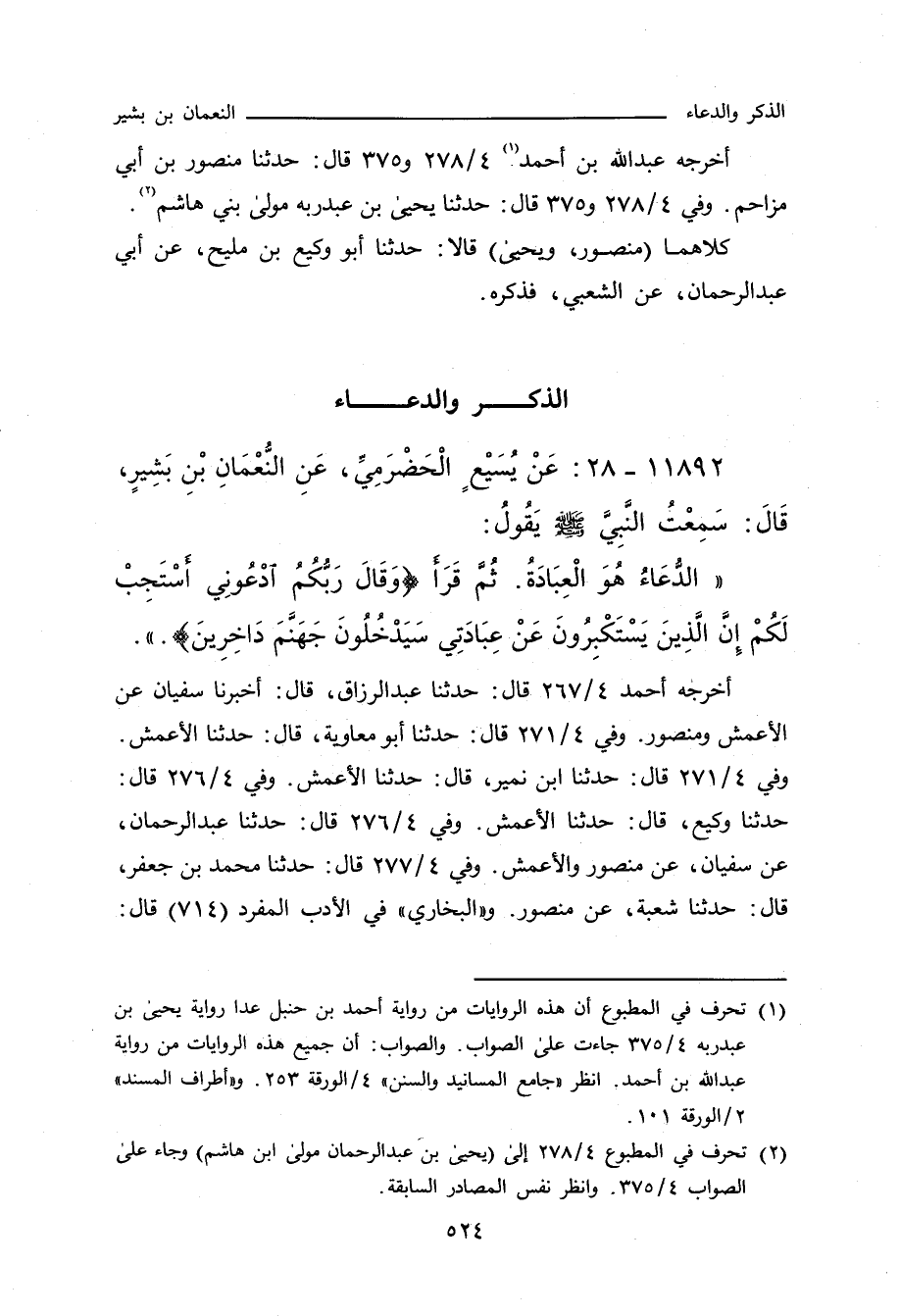 ١١٨٩٢ - عَنْ يُسَيْعٍ الْحَضْرَمِيِّ، عَنِ النُّعْمَانِ بْنِ بَشِيرٍ، قَالَ: سَمِعْتُ النَّبِيَّ صلى الله عليه وسلم يَقُولُ: