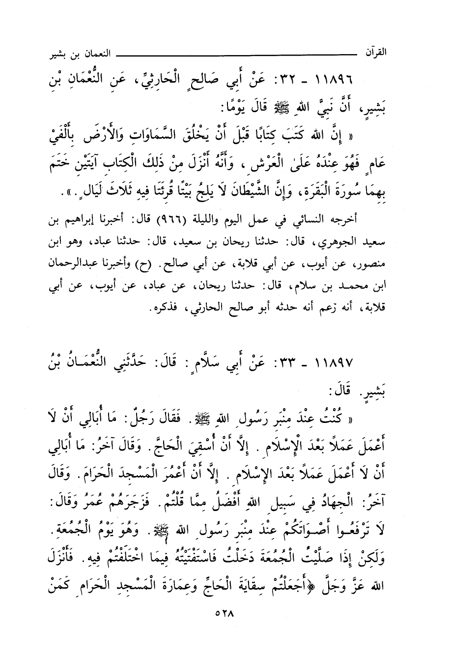 ١١٨٩٦ - عَنْ أَبِي صَالِحٍ الْحَارِثِيِّ، عَنِ النُّعْمَانِ بْنِ بَشِيرٍ، أَنَّ نَبِيَّ اللهِ صلى الله عليه وسلم قَالَ يَوْمًا: