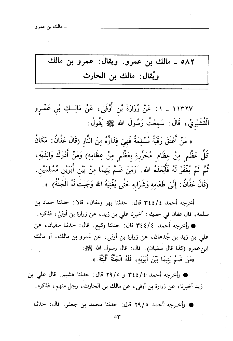 ١١٣٢٧ - عَنْ زُرَارَةَ بْنِ أَوْفَى، عَنْ مَالِكِ بْنِ عَمْرٍو الْقُشَيْرِيِّ، قَالَ: سَمِعْتُ رَسُولَ اللهِ صلى الله عليه وسلم يَقُولُ: