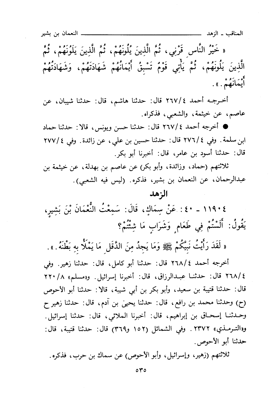 ثلاثتهم (زائدة، وحَمَّاد، وأبو بَكْر) عن عاصم بن بَهْدَلَة، عَنْ خَيْثَمَةَ بْنِ عَبْدِ الرَّحْمَانِ، عَنِ النُّعْمَانِ بْنِ بَشِيرٍ، فذكره ليس فيه: الشَّعْبِي".