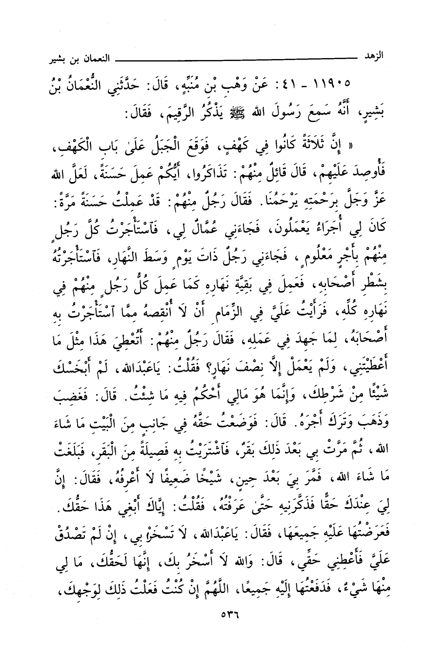 ١١٩٠٥ - عَنْ وَهْبِ بْنِ مُنَبِّهٍ، قَالَ: حَدَّثَنِي النُّعْمَانُ بْنُ بَشِيرٍ، أَنَّهُ سَمِعَ رَسُولَ اللهِ صلى الله عليه وسلم يَذْكُرُ الرَّقِيمَ، فَقَالَ:
